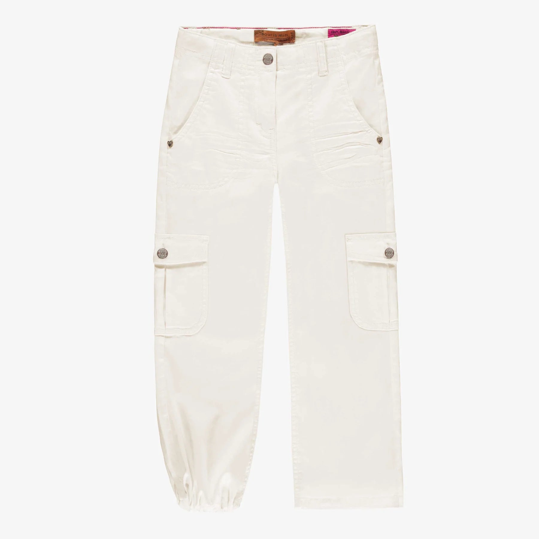 Cream lyocell denim jeans in a regular fit, featuring belt loops, a zipper closure, and a snap button. Notice the cargo pockets and adjustable ankle cuffs that can be gathered or left loose. The elastic adjustment inside the waistband adds extra comfort.