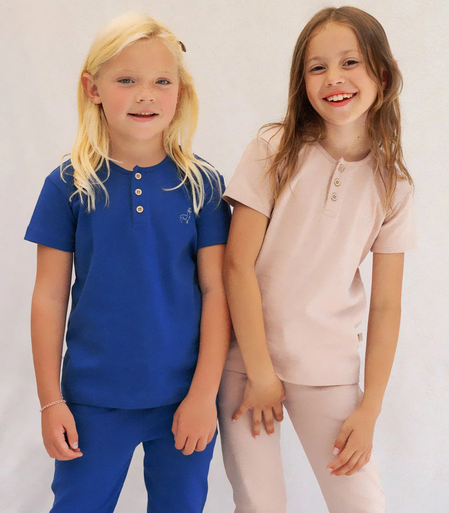 Sourced and ethically made in Peru with 100%  Pima cotton rib fabric Our classic button done tee and matching pants with pockets are  thicker than our previous lounge sets allowing for year round versatility.