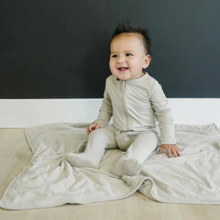 These are Mebie Baby's new bamboo zipper one-pieces. They are made out of the same soft bamboo fabric as our stretch swaddles. This features a double zipper that zips from the top and bottom meant for easy diaper changes. We have a lot of gender neutral options making them great for all babies. The functionality of these one-pieces make them a baby essential. We have matching head wraps & hats that complete the perfect look for a hospital take home outfit.