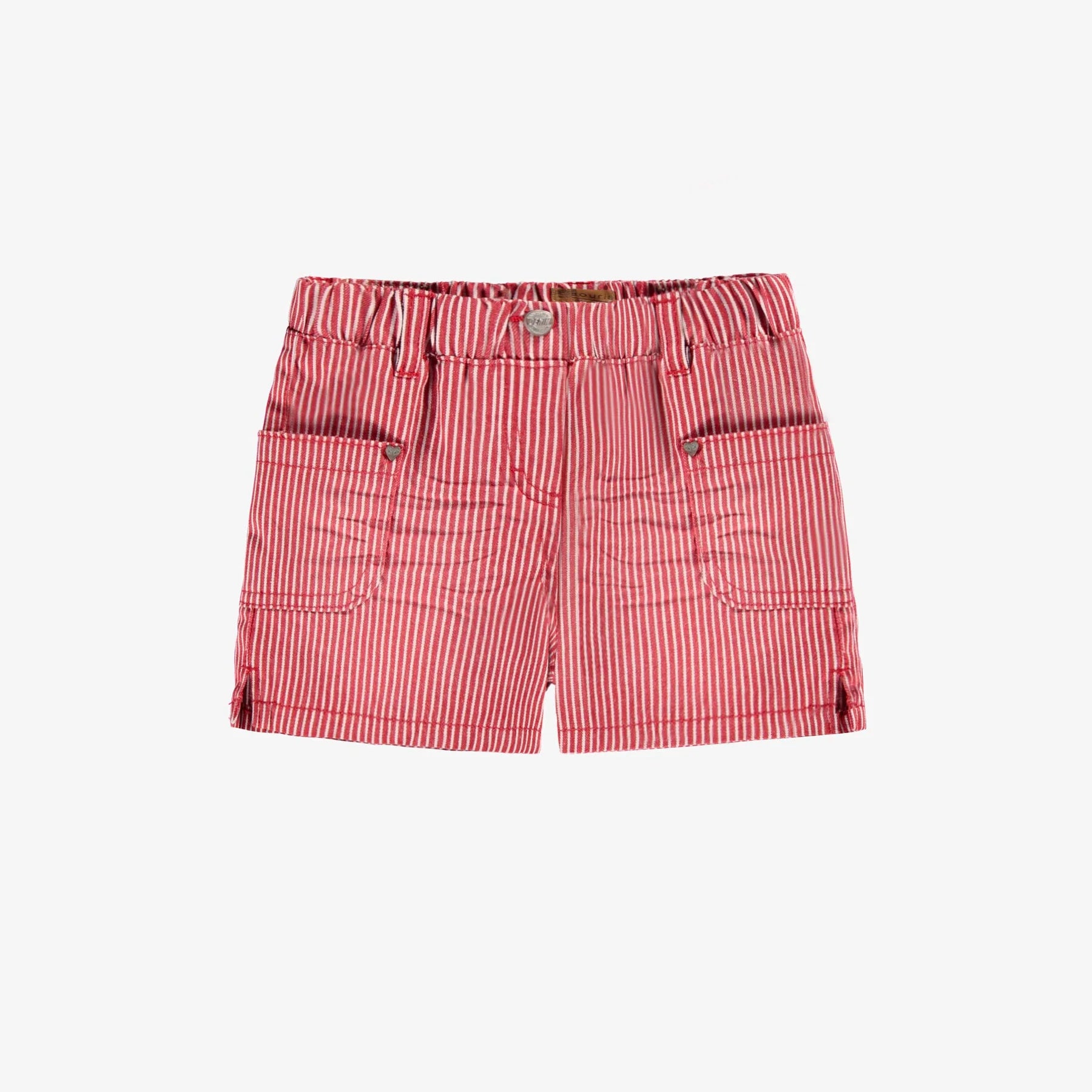 Red and white vertically striped shorts in regular fit cheminot denim with elastic waistband and belt loops. The fly and button are decorative. Note the worn details on the edge of the pockets, accentuating the retro look.