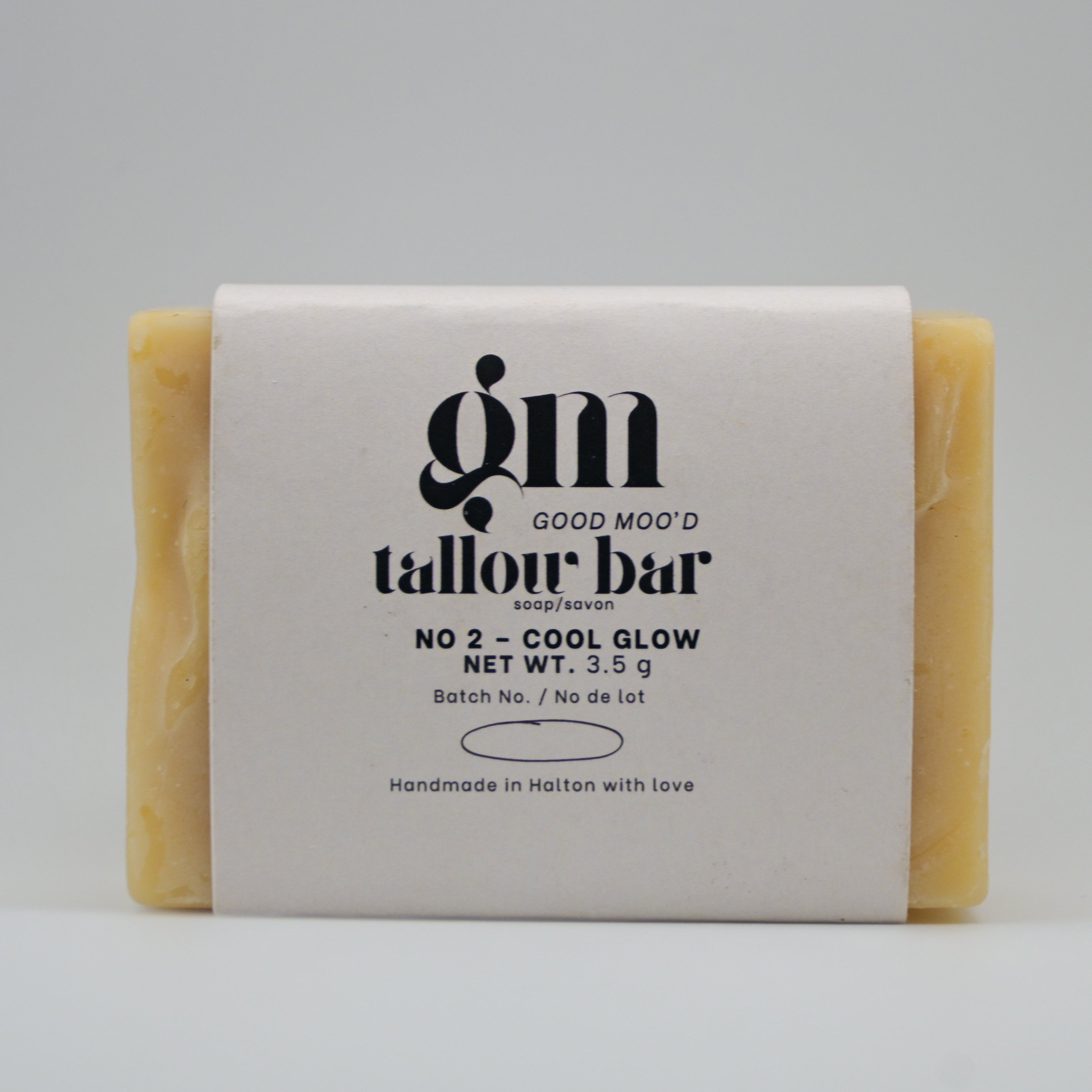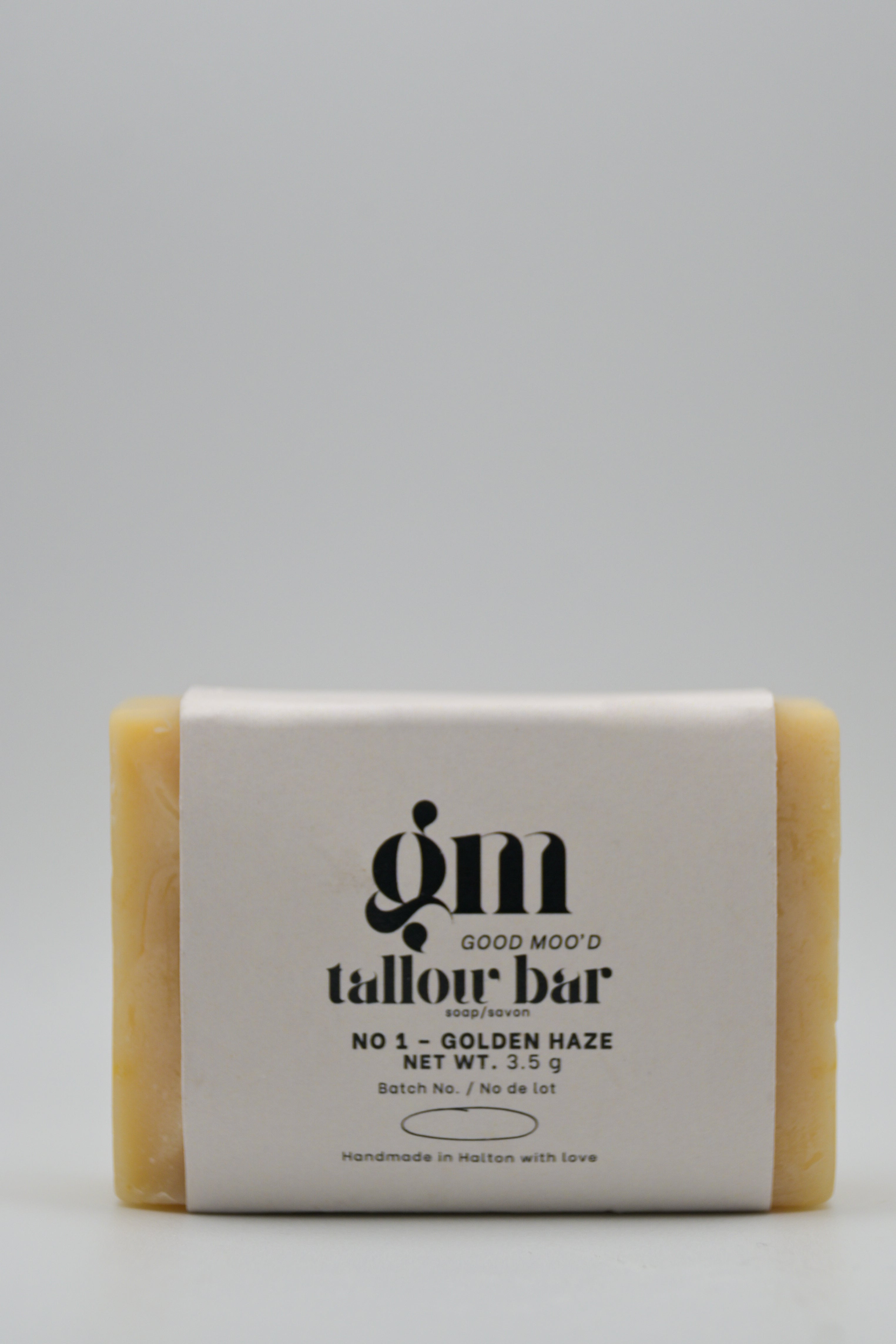 Naturally raised, antibiotic‑free, free‑range Ontario beef tallow, essential oil (peppermint or honey), beeswax, honey, lye.