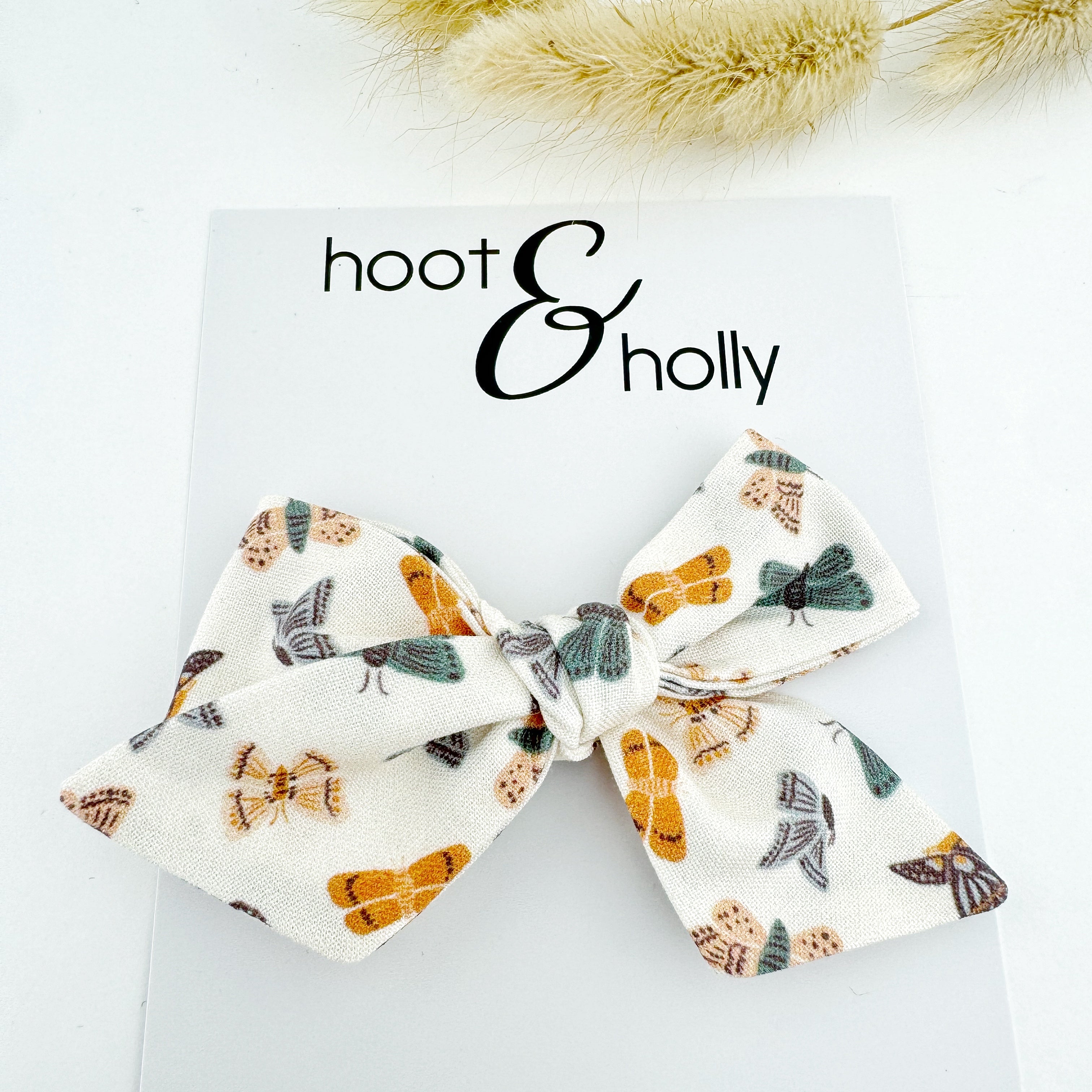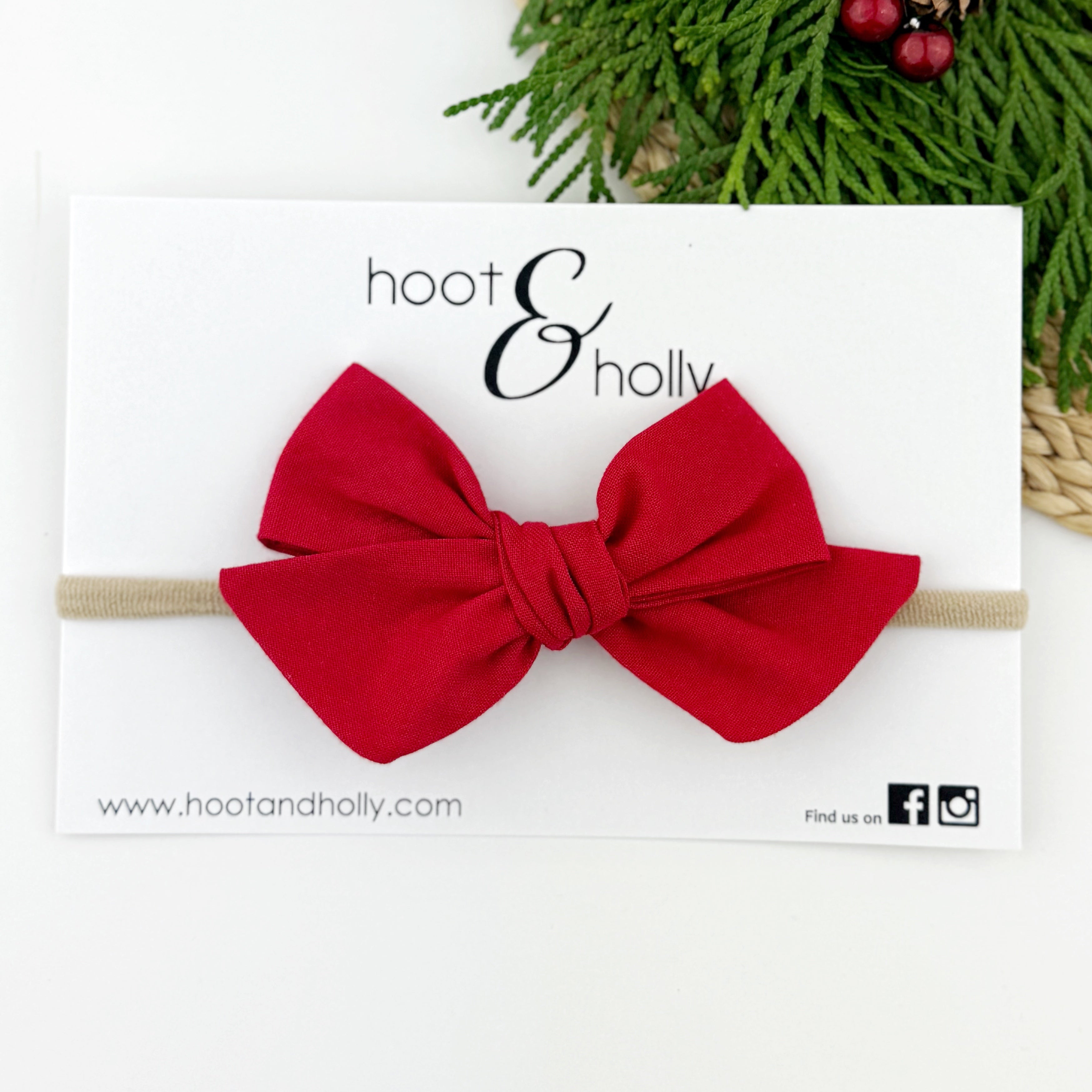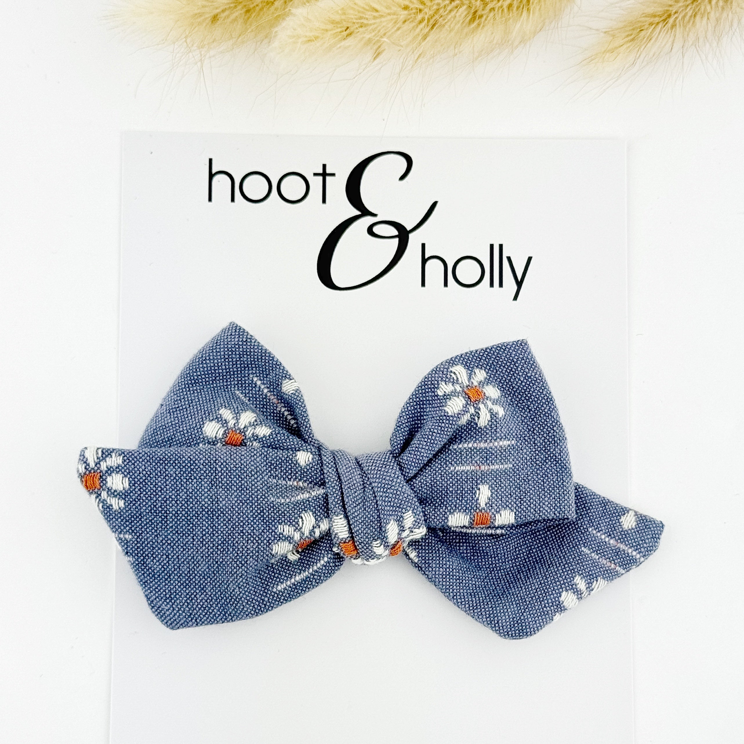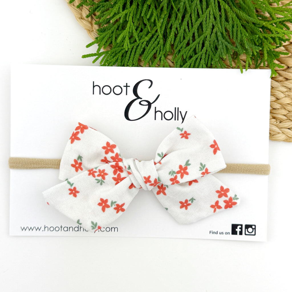 Beautifully crafted hand tied hair bow, the perfect size for babies, toddlers and girls of all ages. Victoria Bow size: 4" wide by 3" Nylon Headband - soft nude nylon that fits newborn to child. Premium no run nylon that is lightweight and gentle. Fabric: high quality cotton Handmade in Canada.