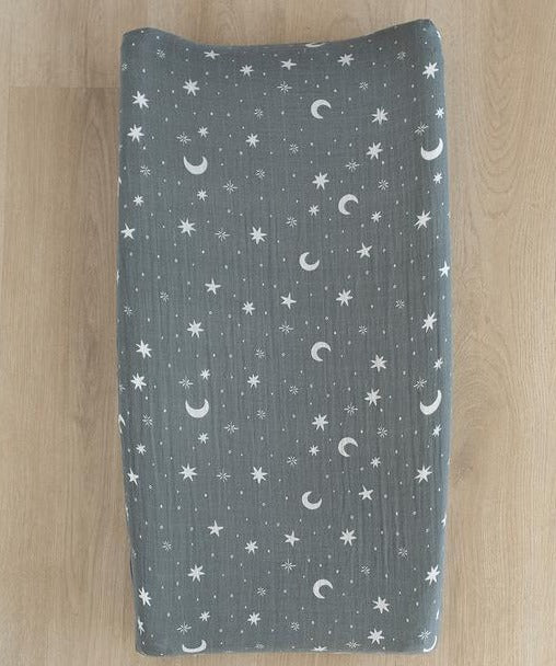 Night Sky Changing pad covers are made with our exclusive designed fabric. They are soft, breathable, easy to wash and to put on and off the standard changing pads. The measurements are 32" x 16".