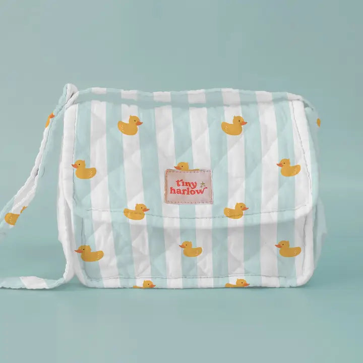 The convertible Tiny Harlow diaper bag for dolls, in our exclusive print, is the perfect accessory for your clients' baby dolls! The diaper bag includes a matching diaper, bib, and changing mat for the doll and perfectly complements our Tiny Tummies jar and spoon sets. It also features two convenient side pockets for the magic milk and juice and is very easy to use with a Velcro button, perfect for little hands that can open and close it with ease. The diaper bag is also easily interchangeable, switching from a crossbody bag to a cool backpack with a snap button.