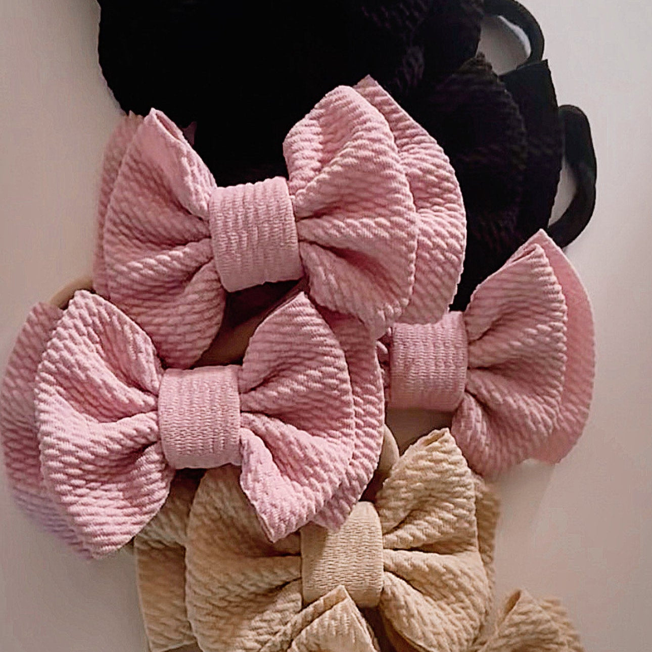 Mini Waffle Bows are hand sewn on a tan nylon band. Mini Black Waffle Bows are sewn on a black nylon band.  All bows have are made with comfort in mind.  Mini bows are one size fits all.
