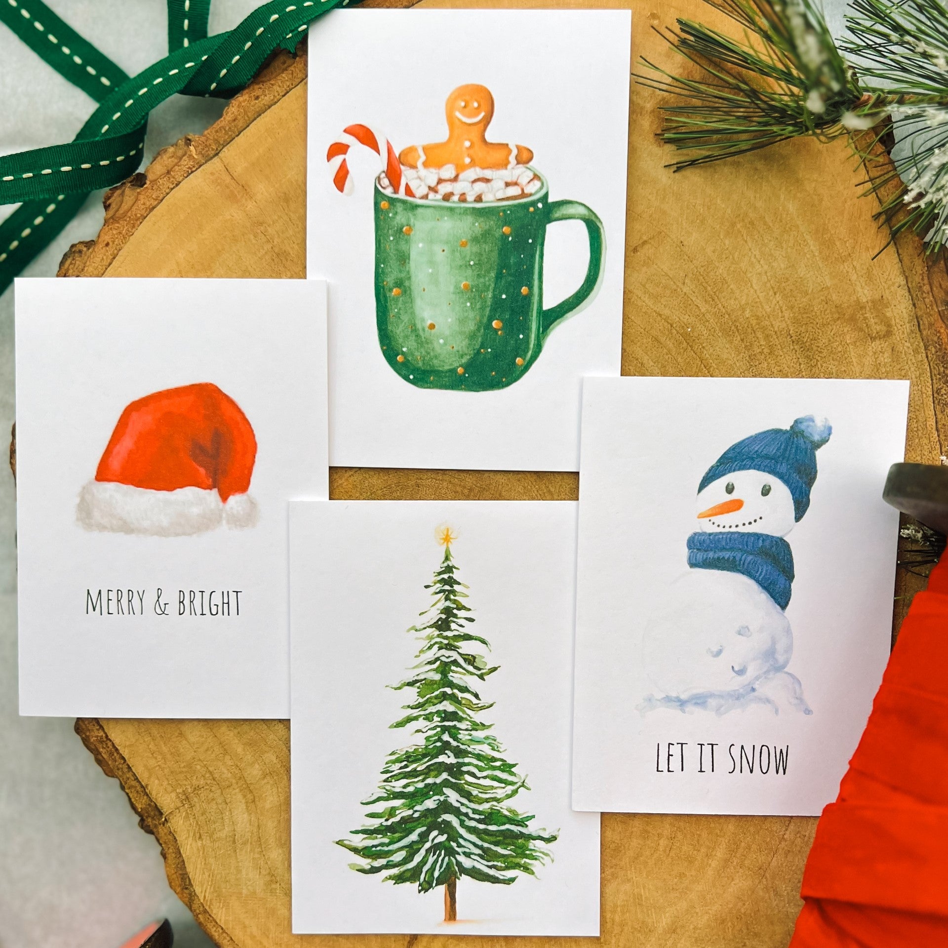 Hand painted, printed greeting cards for the holiday season, all made local to Petit Nordique Boutique. Each card is one of a kind and art and fonts can vary.