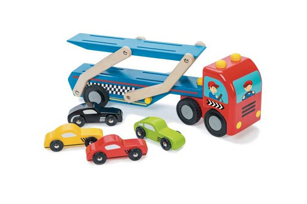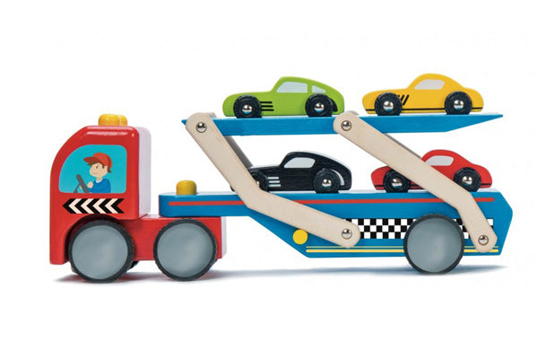 A stylish retro car-carrier truck with 4 cool racing cars. Lower the top ramp to load the cars. Set includes 4 racing cars, and is great for learning colours and developing hand/eye coordination. Comes together with a sheet of 36 colourful stickers featuring car numbers 1 to 4, cars & road illustration. Vehicles are compatible with standard wooden toy train tracks.