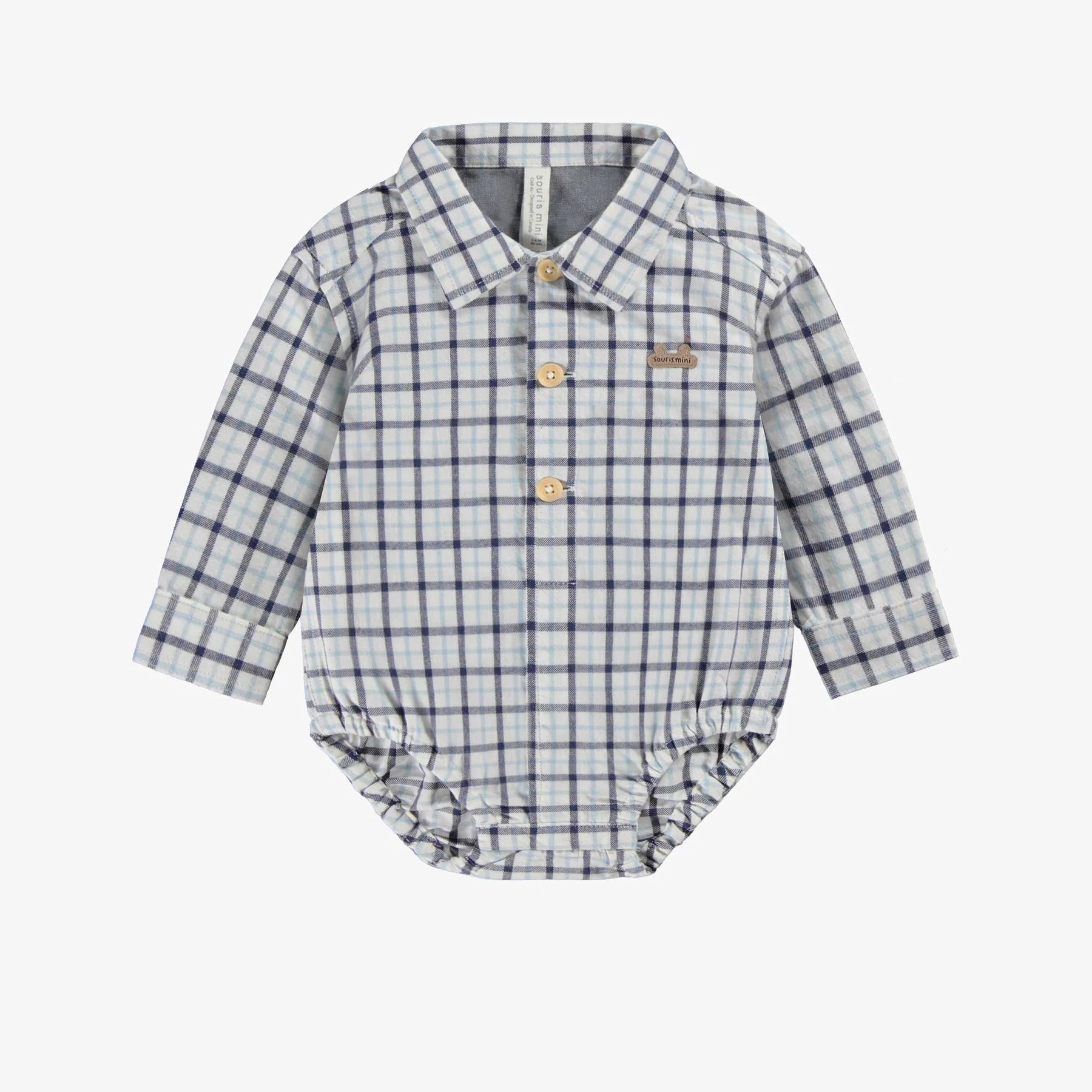 A polished look made practical. This plaid flannel bodysuit features a classic shirt collar and three front buttons, blending timeless style with everyday ease. Snap closures at the inseam and gentle elastic at the leg openings make dressing a breeze.
