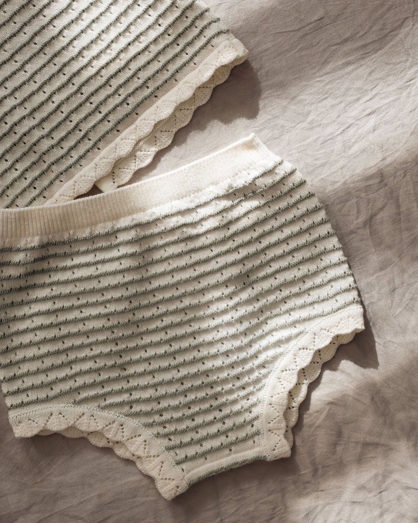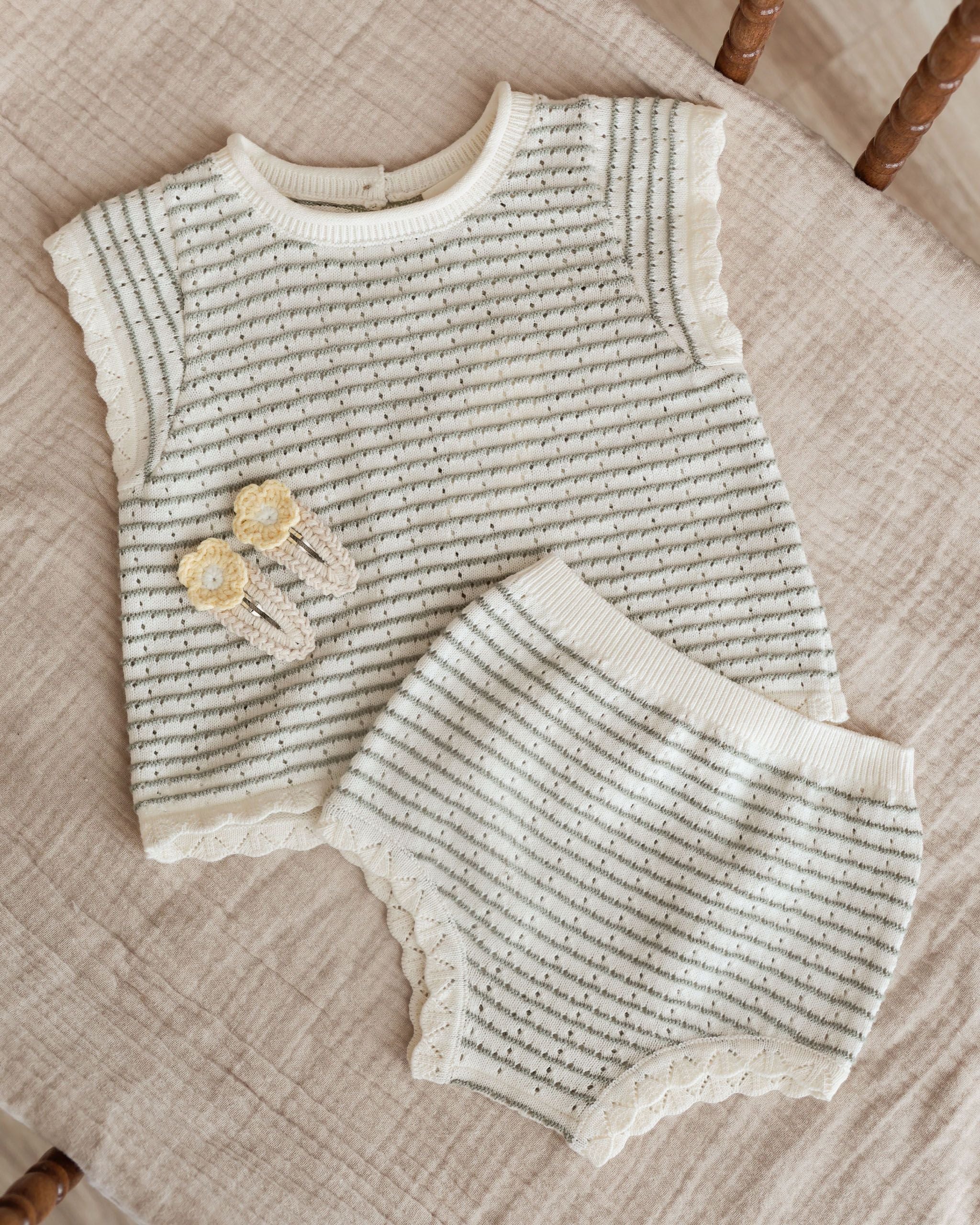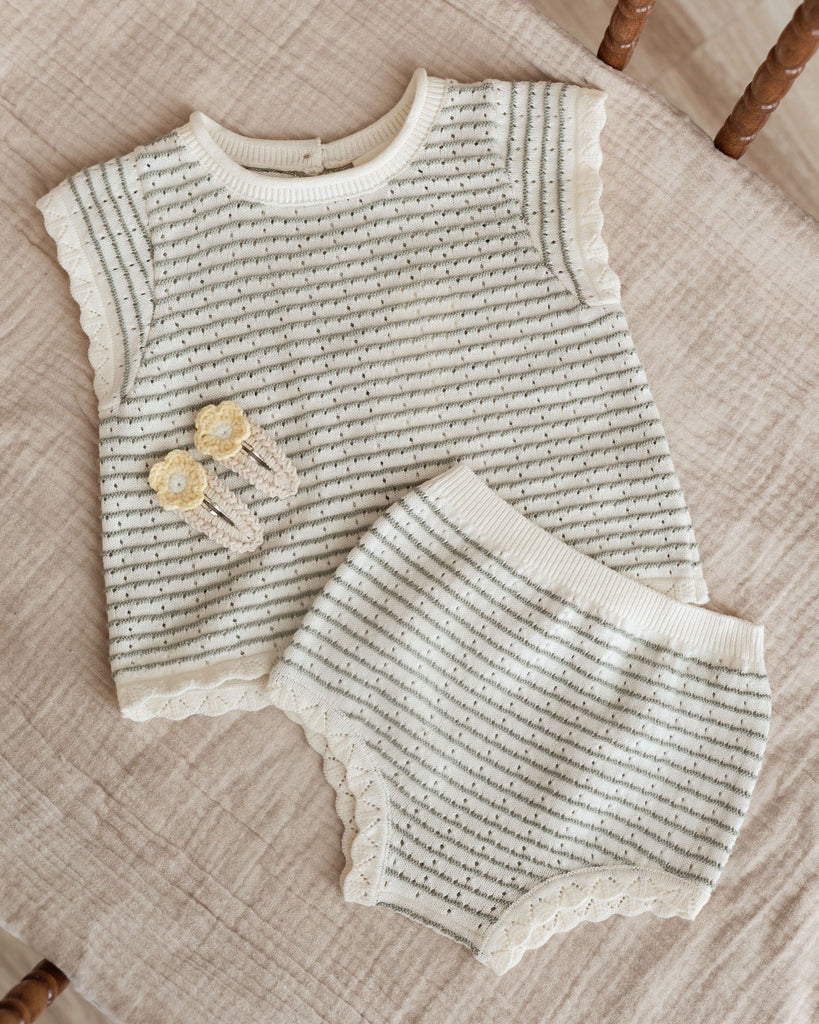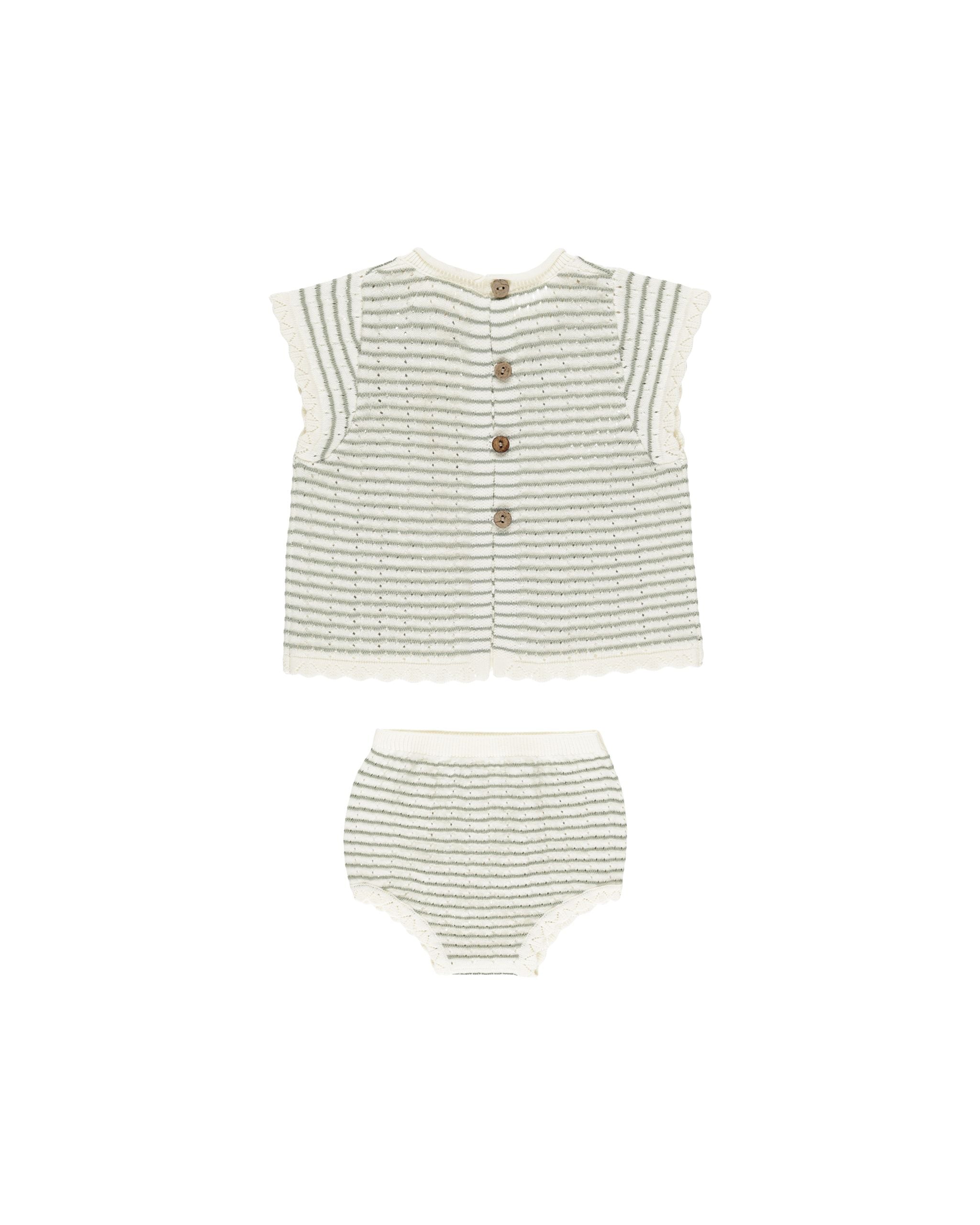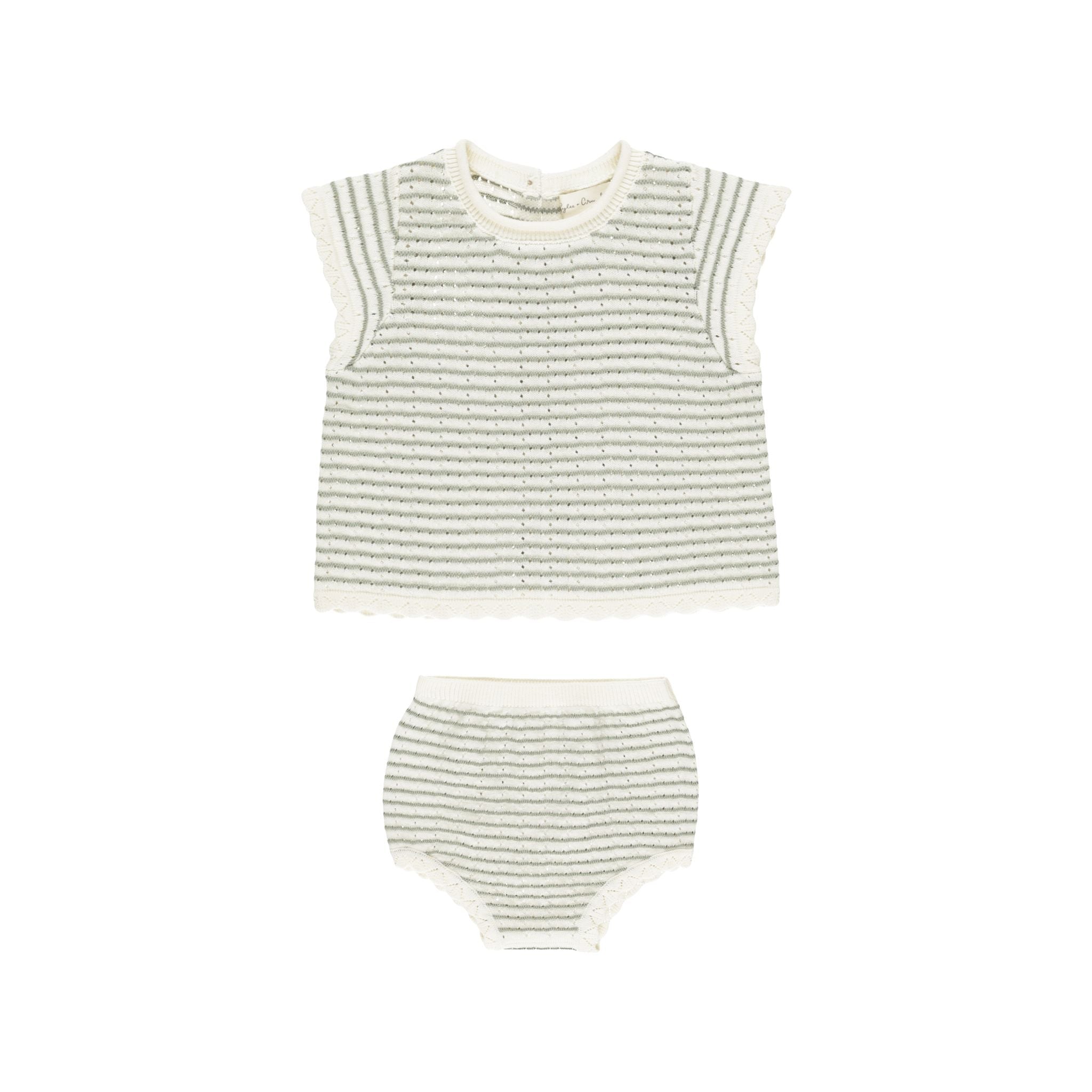 Featuring the 'sage stripe' pattern on the pointelle cotton knit. We are loving this summer knit look!