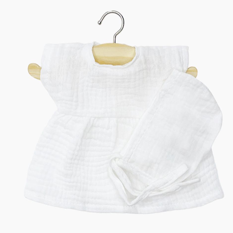 Faustine dress with short sleeves and round bonnet in double gauze for Minikane Babies 28cm dolls.