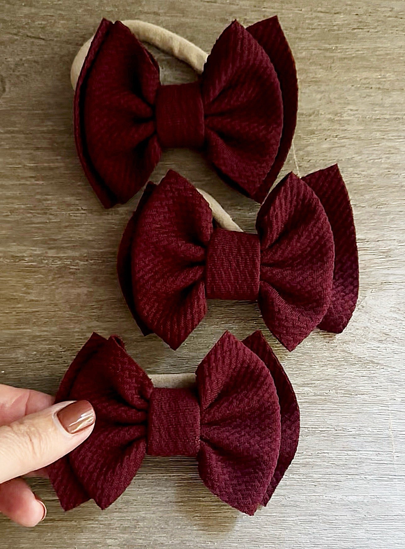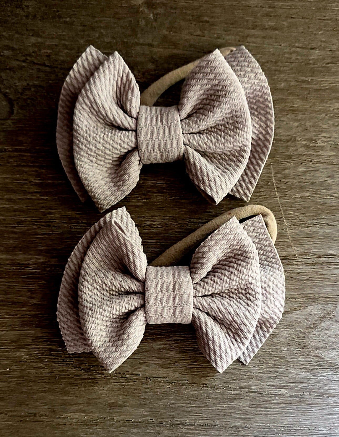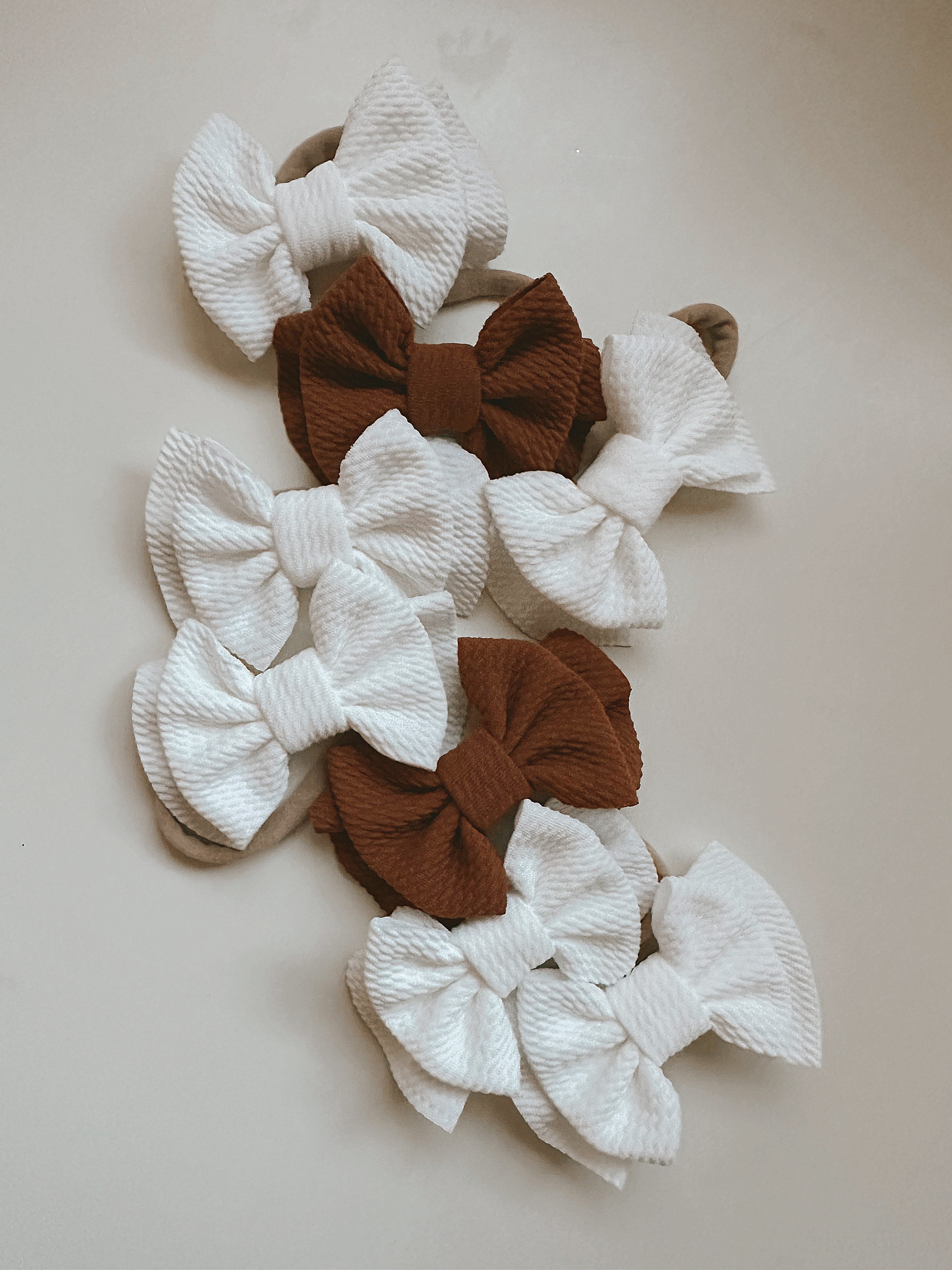 Mini bows are all hand sewn on a tan nylon band with one exception being the black is sewn on a black nylon band.. All bows are hand sewn to provide exceptional comfort for your baby. Mini bows are one size fits all.