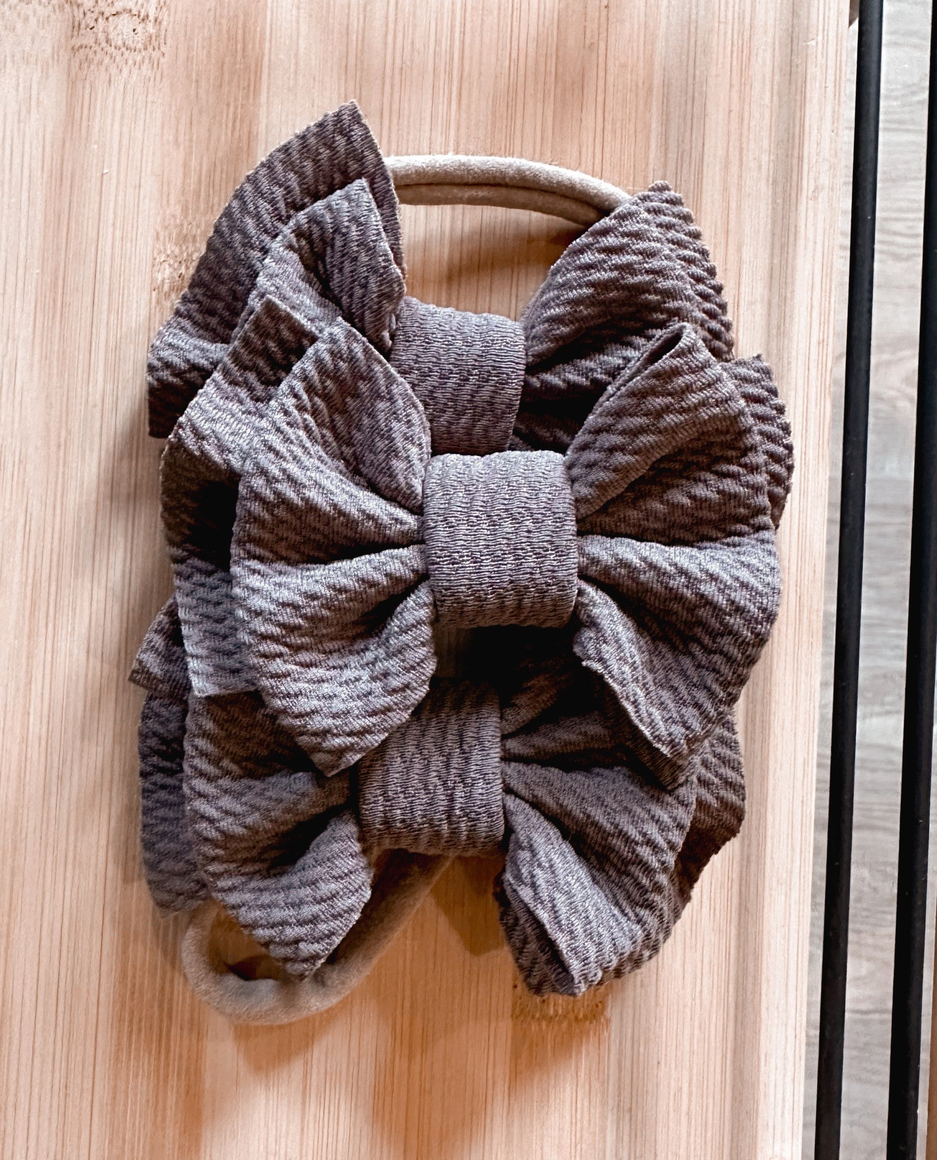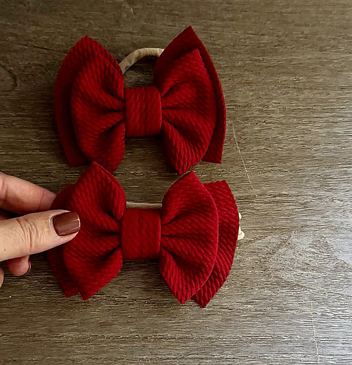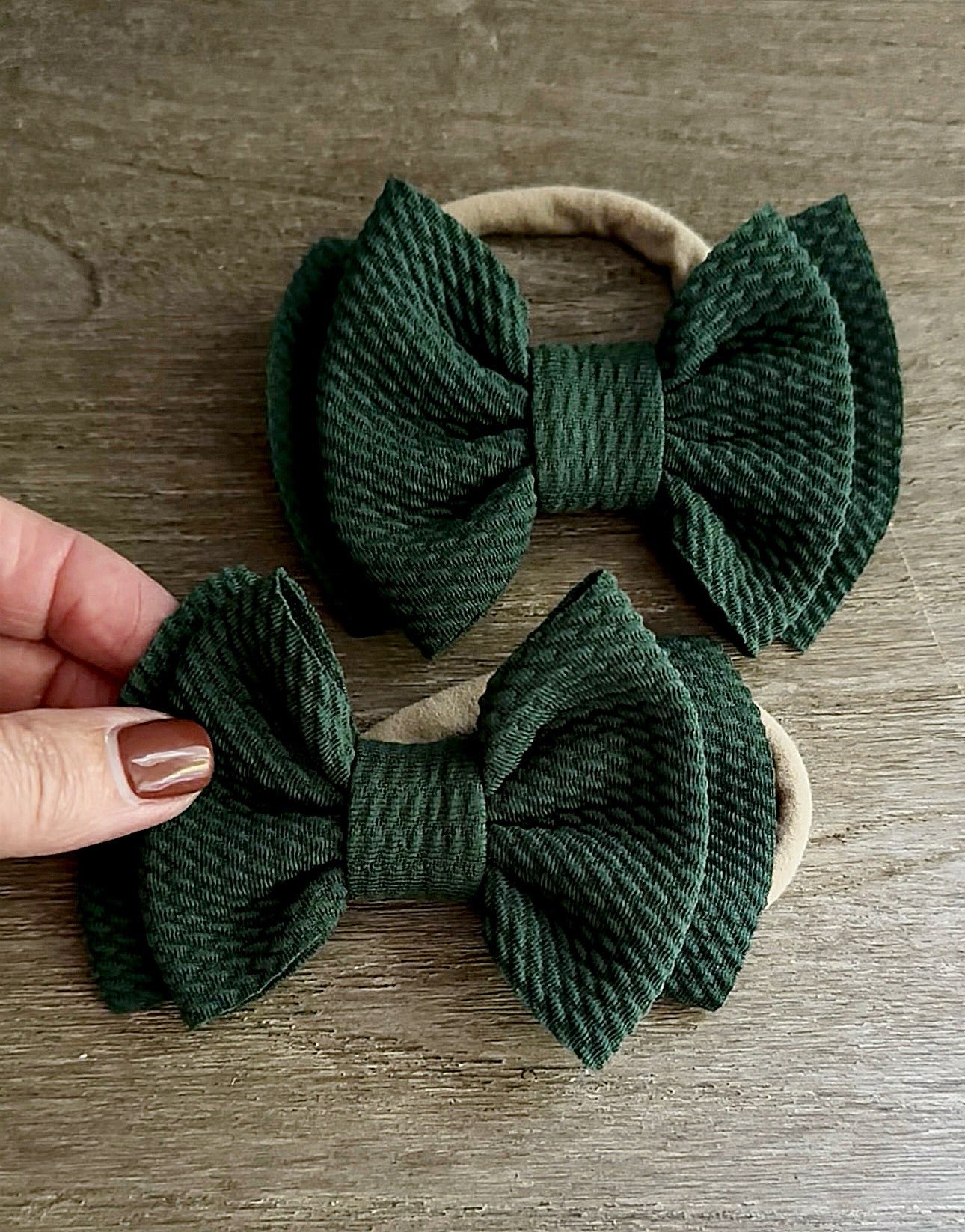 Mini bows are all hand sewn on a tan nylon band with one exception being the black is sewn on a black nylon band.. All bows are hand sewn to provide exceptional comfort for your baby. Mini bows are one size fits all.