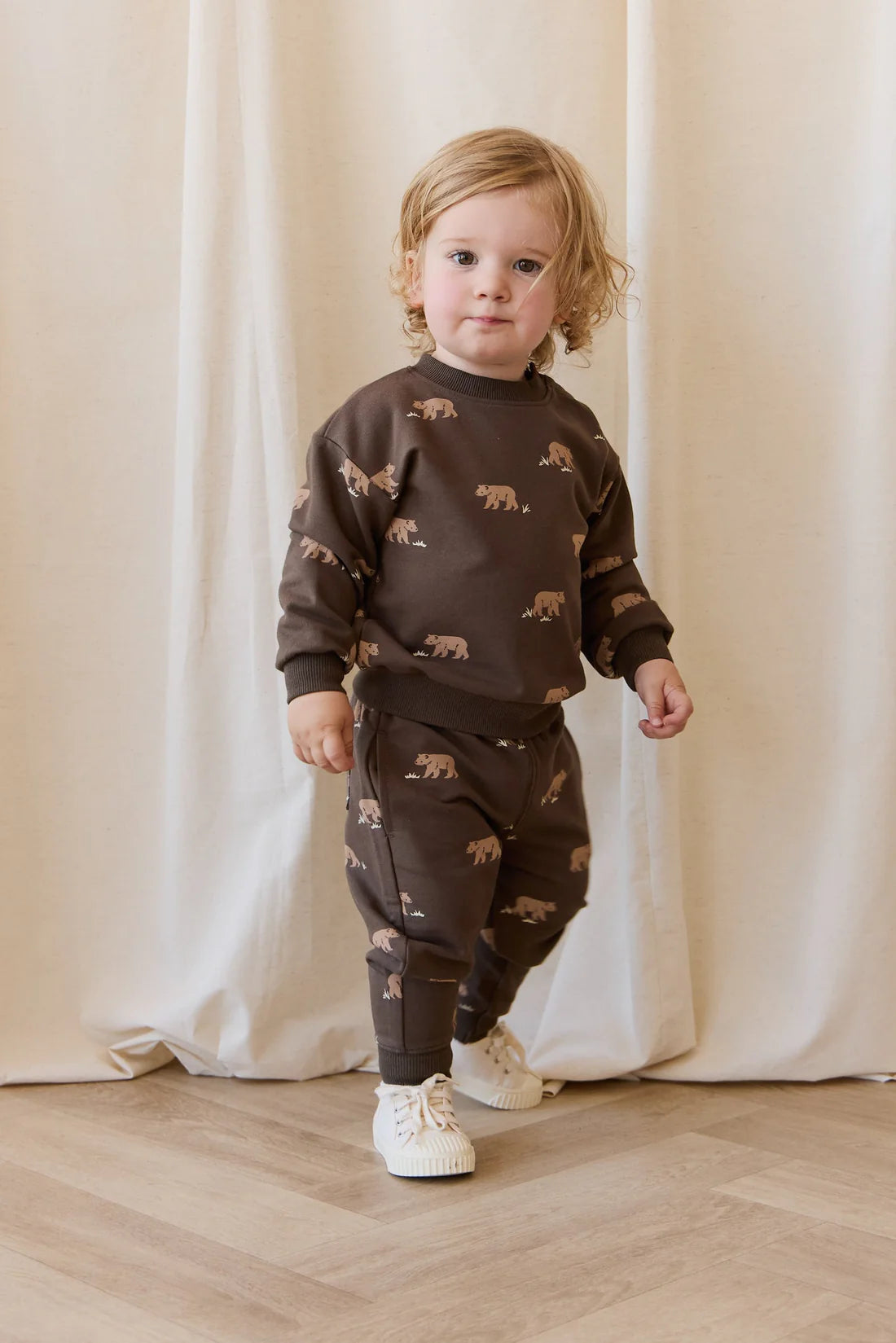 The Dominic Track Pant in Bear Buddies Canteen is a playful and practical piece for your little one’s wardrobe. Crafted in a rich brown tone, these pants feature a charming bear motif walking through grassy trails, with a soft elastic waistband, white drawstring, and ribbed cuffs for a comfy fit.