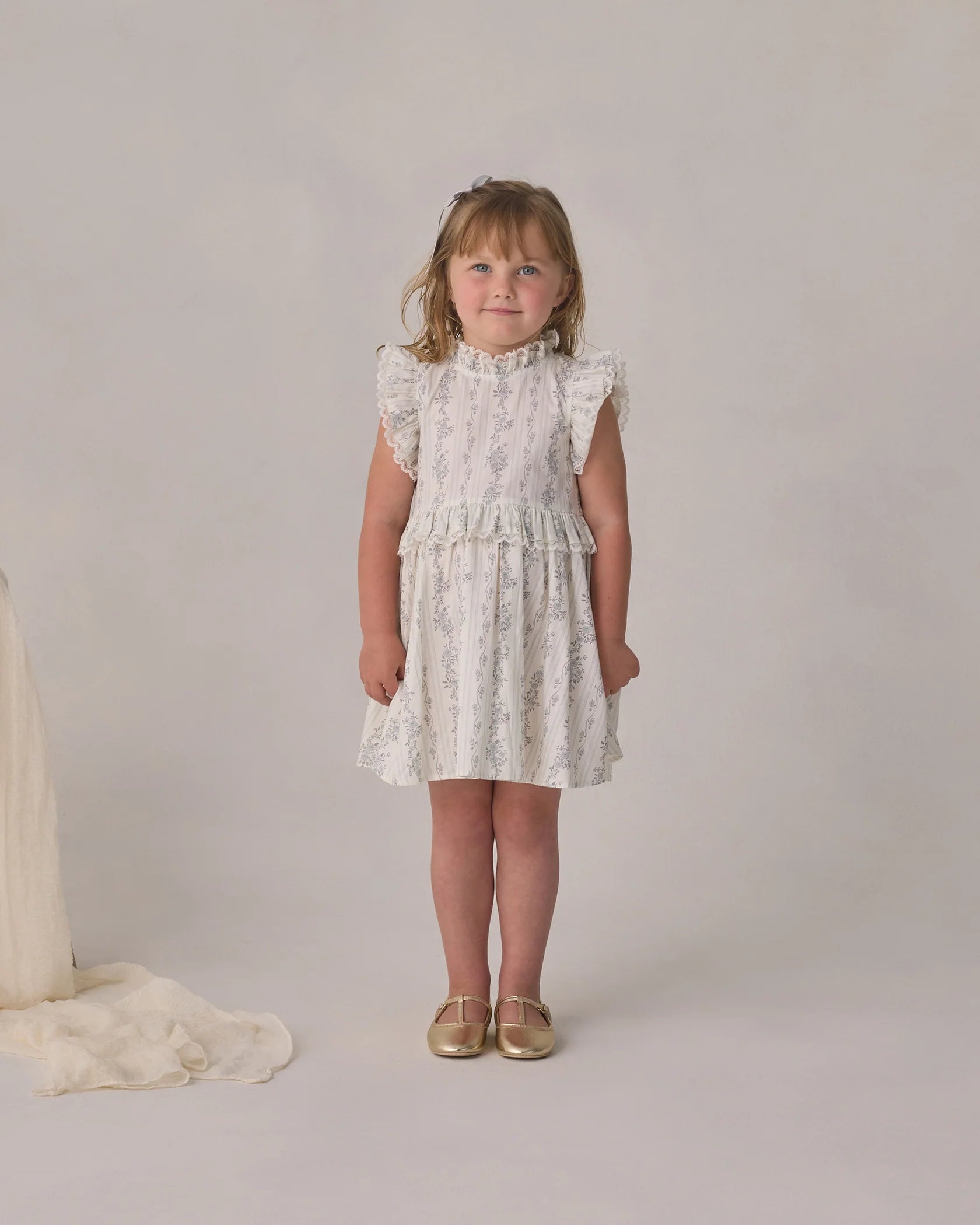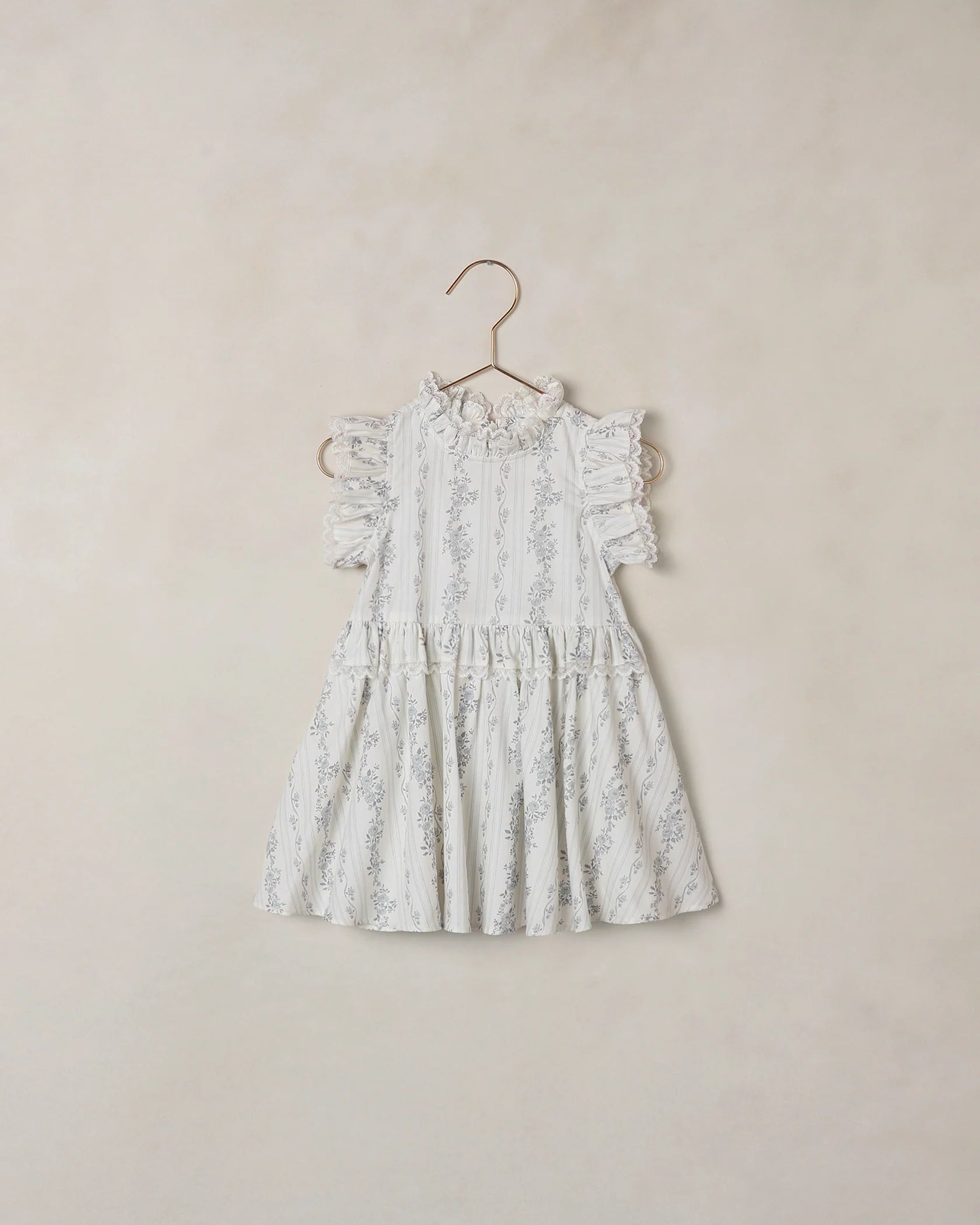This enchanting dress features delicate ruffles at the neckline and waist with embroidered lace trim. A simple silhouette perfect for the sweetest of days. Zipper closure at the back.