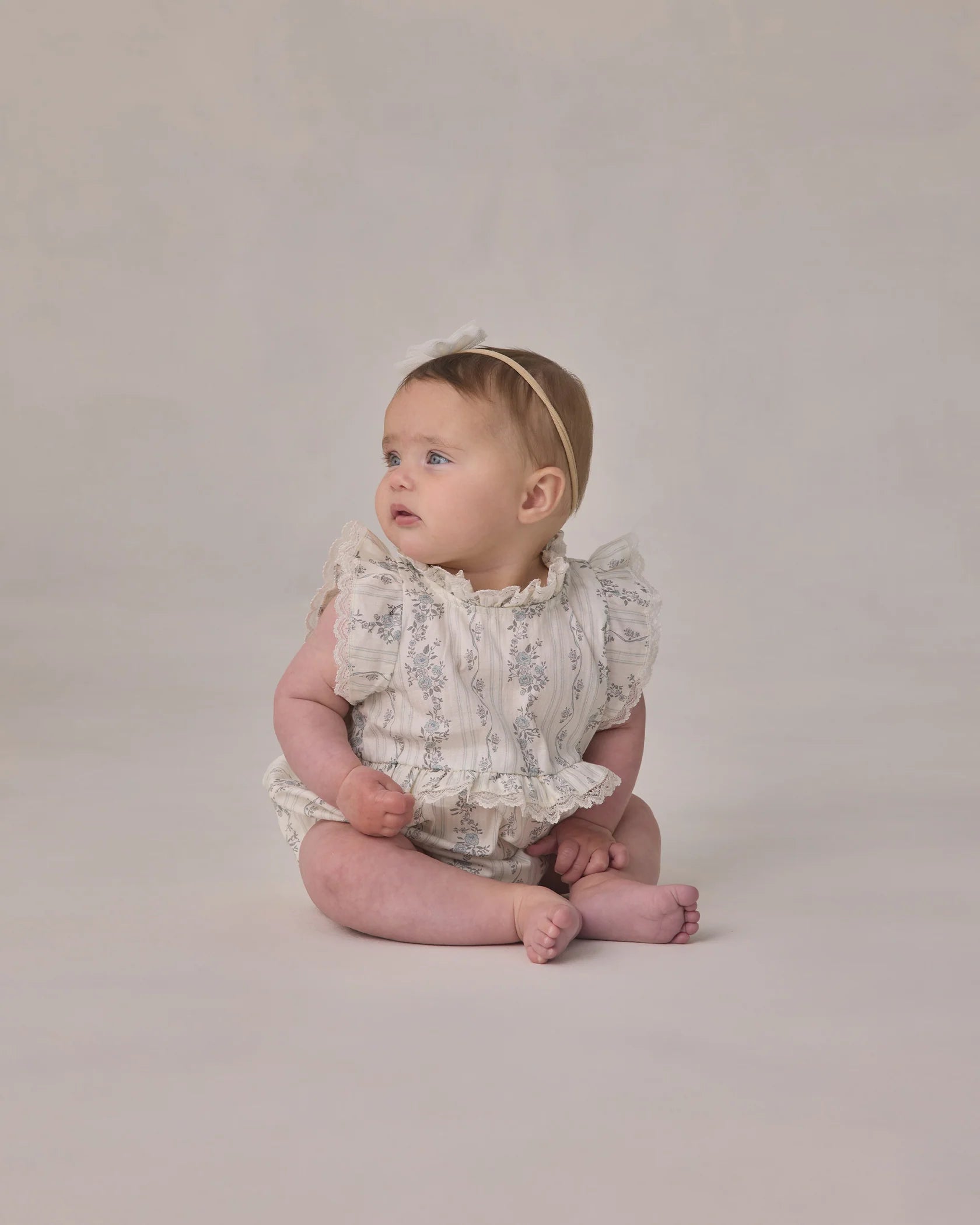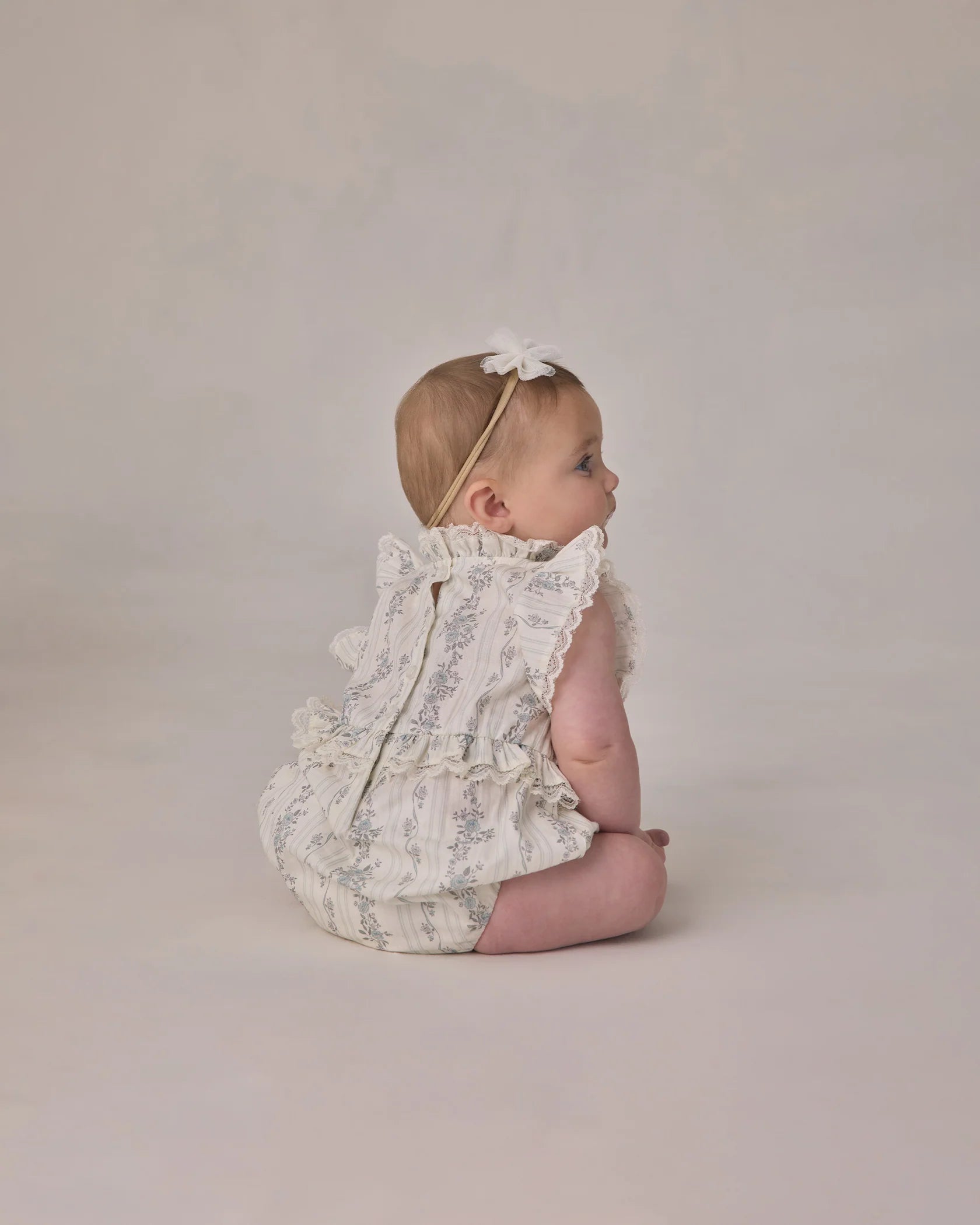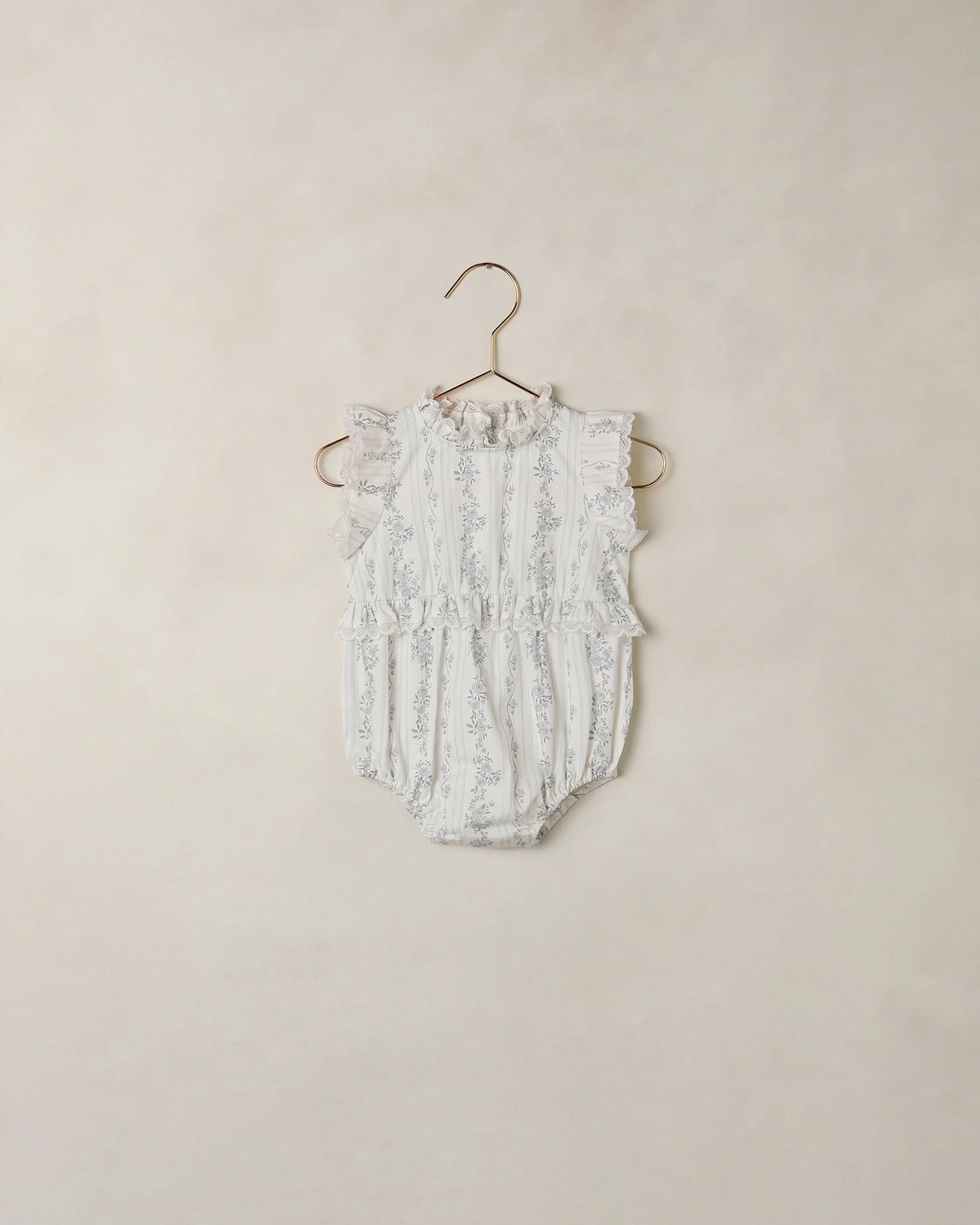 Delicate ruffle and lace trim come together in this sweet romper silhouette. Four button closure at the back, bottom snaps, and elasticized leg openings for easy dressing. Coordinates perfectly with the Alice Dress for a darling matching look.