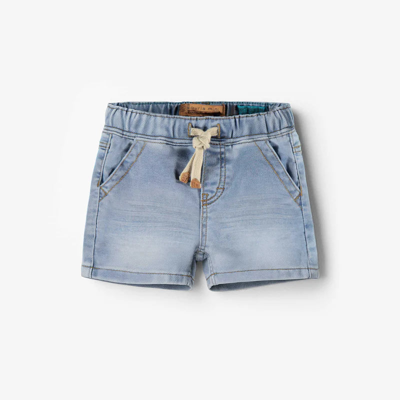 Blue denim shorts, a must-have in baby’s summer wardrobe. Features an elastic waistband with an adjustable drawcord. Includes two front pockets and two back pockets. Made from soft, comfortable denim in a relaxed fit.