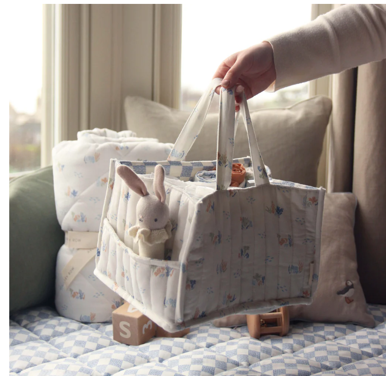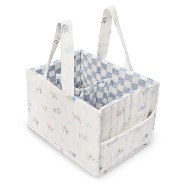 The perfect addition to your baby changing station. This quilted nappy caddy has 2 outer pockets and 3 inner compartments, perfectly sized for storing nappies, creams and wipes. Handles make the caddy portable so your baby changing essentials can always be close to hand.
