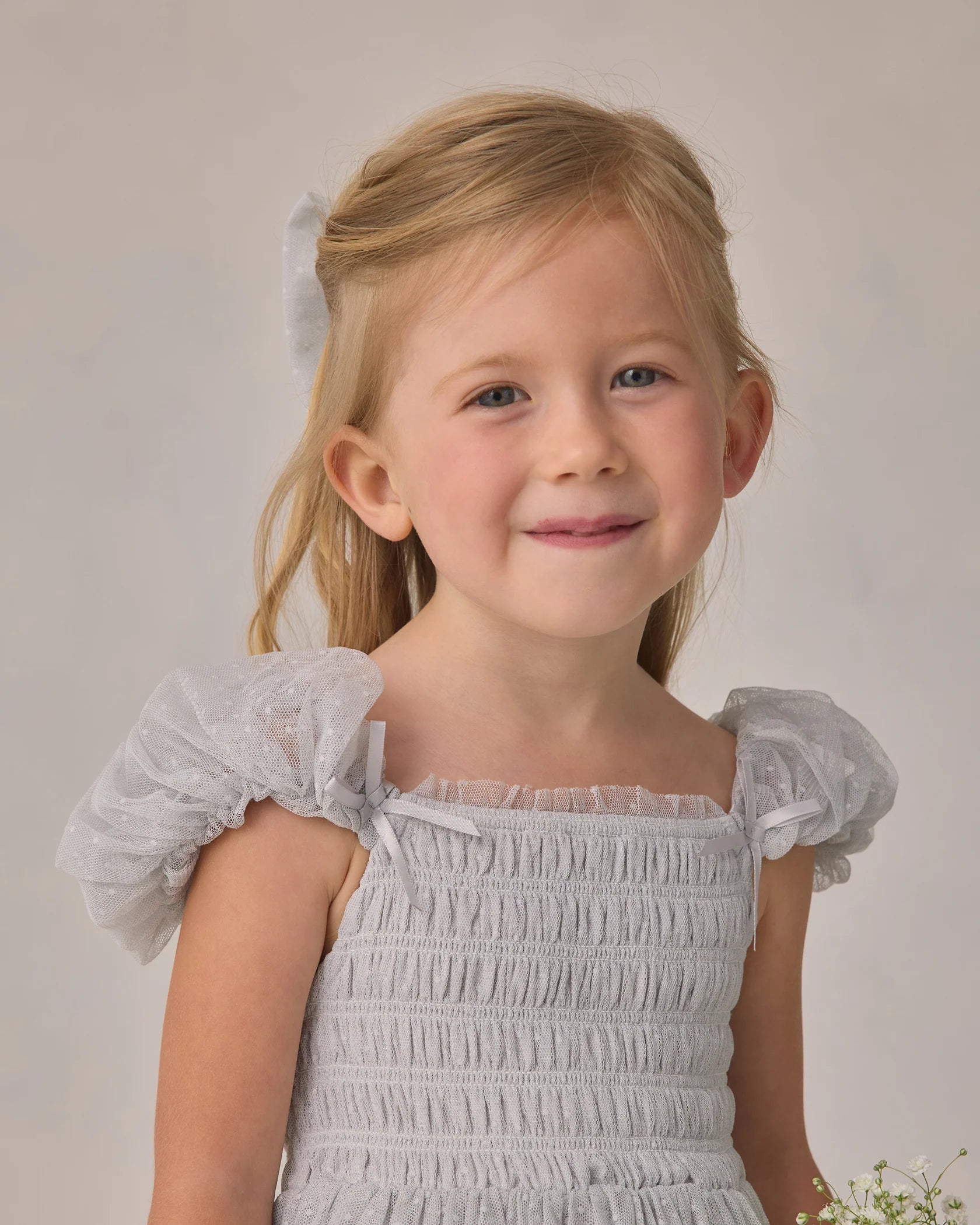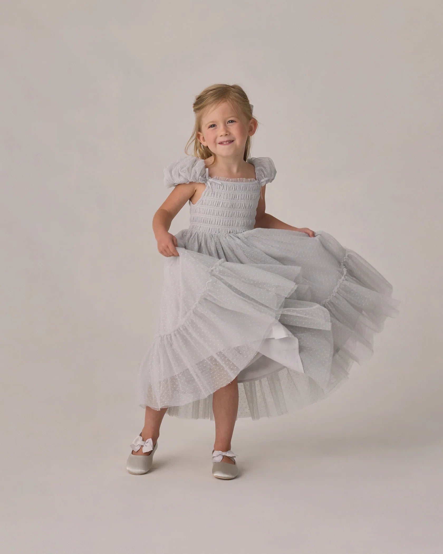 The Clara Dress, made from the swiss dot tulle, features a smocked bodice with bow detail, and a full tiered skirt.