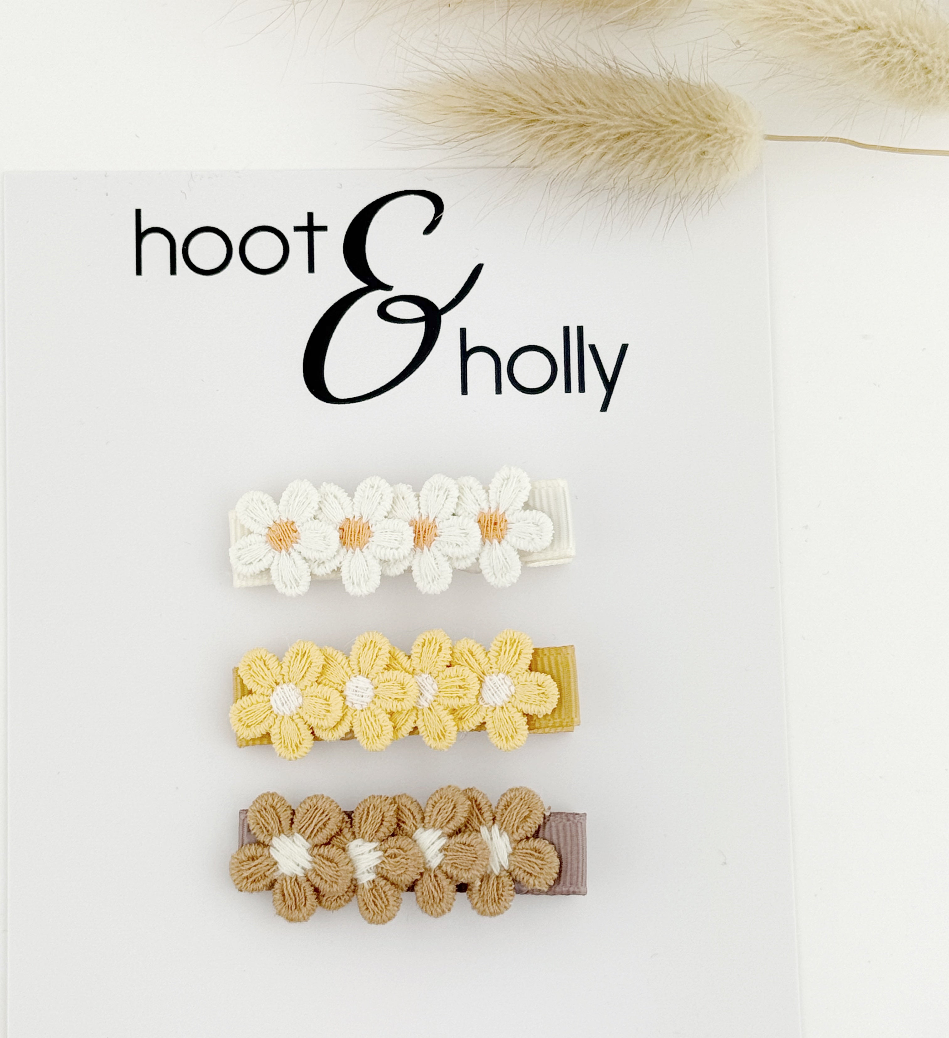 Gorgeous embroidered daisies attached to matching clips. They clip into hair with ease and stay put for all day wear. They are 1.75 inches in length. Available in two choices of clips: 1) Lined non-slip alligator clip || super gentle with a silicone grip || for baby and toddler bangs and fine hair girls 2) Teeth Clip || amazing hold for all day wear|| medium to thick hair Handmade in Canada * This product contains small parts which may pose a choking hazard. This item is not a toy and is not recommend for children under 3.