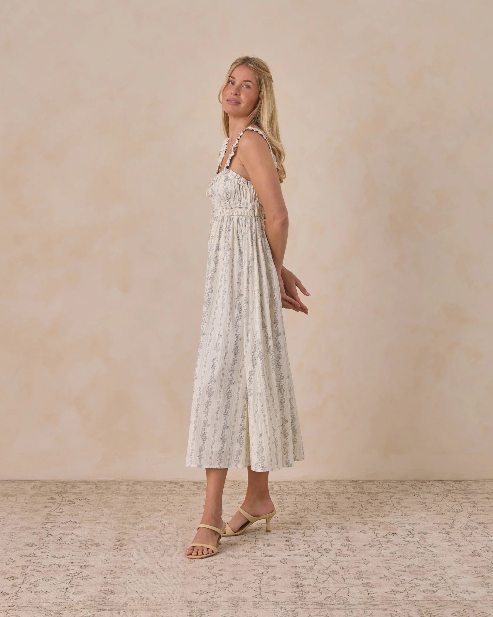 Welcome spring in the new Jane Dress designed with a self gathered ruffle along the neckline and straps, and a smocked shirred waist for both a comfortable and flattering look.