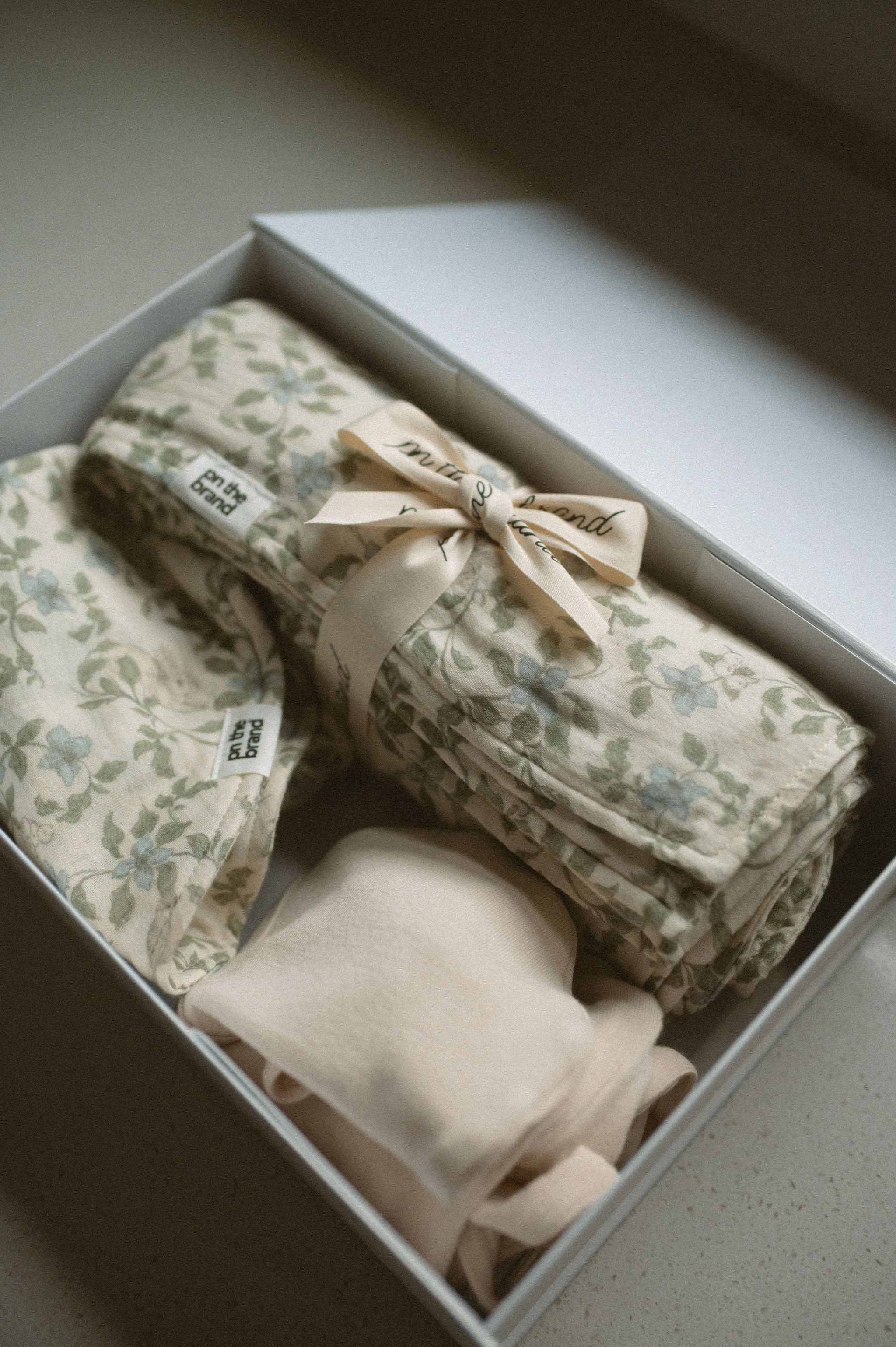 Includes: Side-tie playsuit, bonnet, swaddle, bib, and burp cloth.