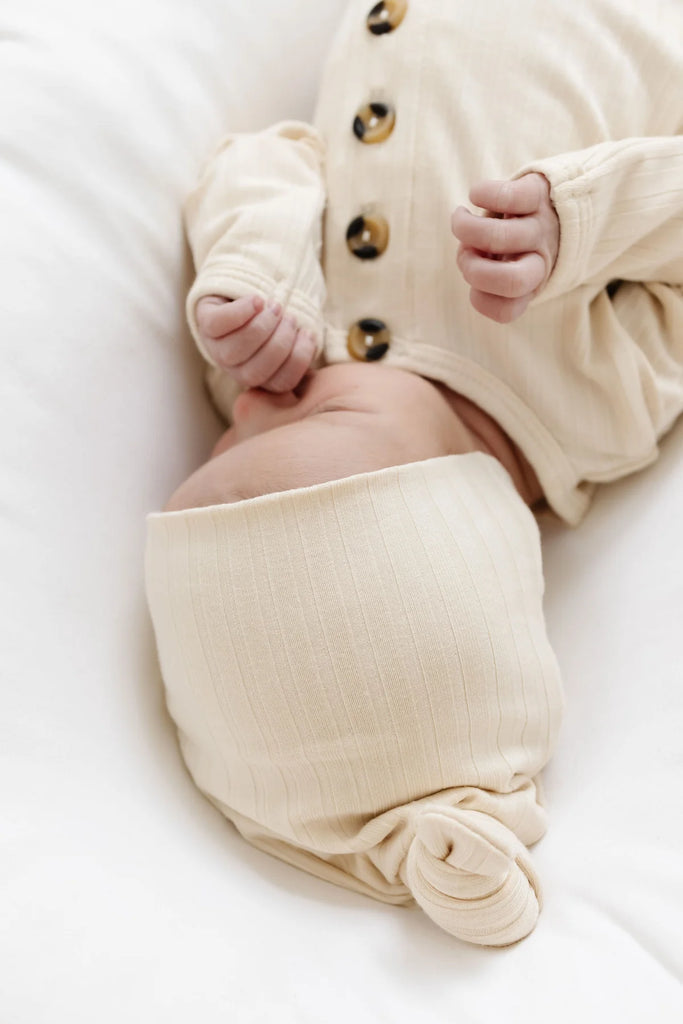 Top baby’s cozy layette with our ultra soft hats made snug enough to stay on all day. More than a (darling) accessory, they mimic the warmth of the womb and help regulate baby’s temperature. Hats pair perfectly with our swaddles, gowns or top and bottoms.