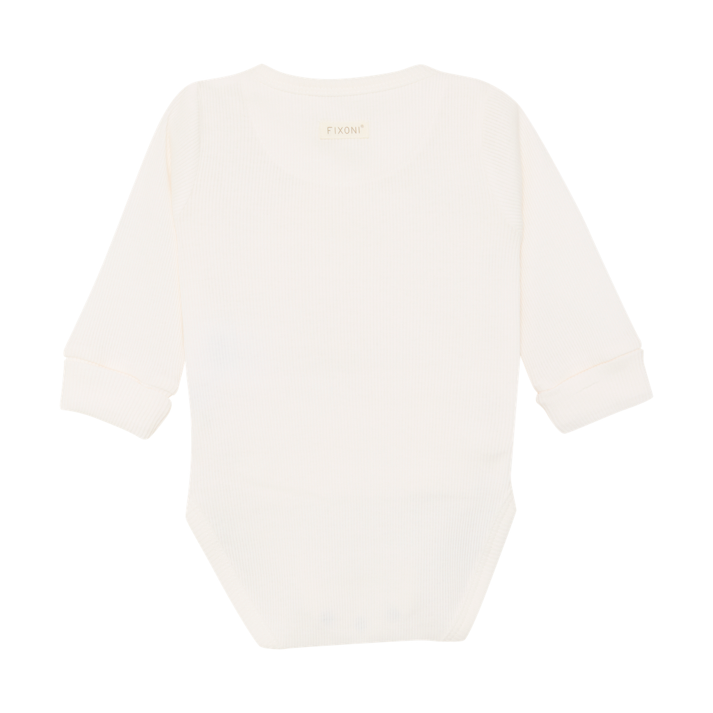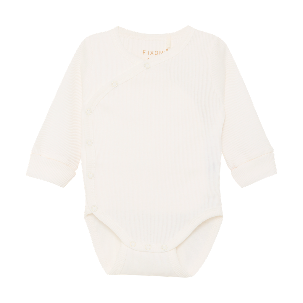 Sweet, solid-colored FIXONI wrap body with long sleeves, made from fine ribbed quality The body’s sleeves can be folded up at the wrists, allowing the length to be adjusted as needed. There are two rows of snap buttons between the legs, allowing the body to grow together with the baby. Closes easily with snap buttons along the front.