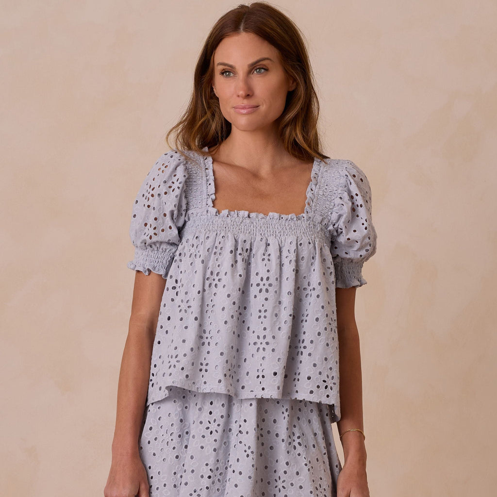 The Rose Mini Skirt is a sure summer staple. This beautiful eyelet style comes with a double tiered skirt and a gathered waistline.