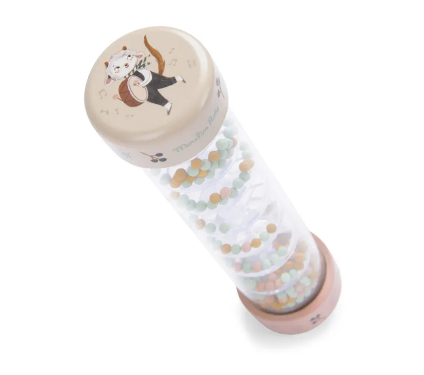 This rain stick will also stimulate the visual acuity of the little ones because all the balls are visible through the transparent wall. By turning the stick over, the balls of 3 colours pass through 5 wooden helixes of 2 different shapes and recall the soft sound of falling rain, which is very pleasant to listen to.