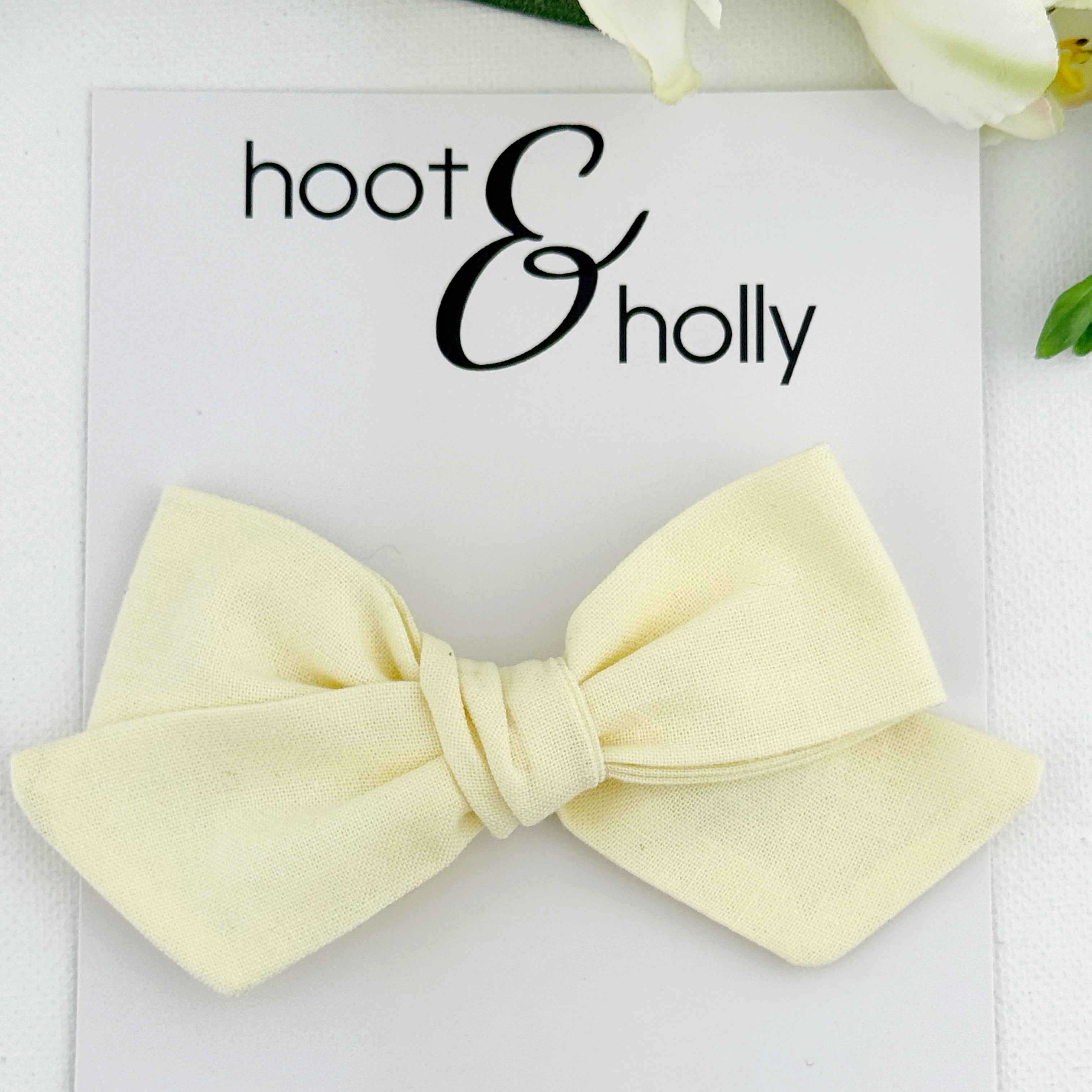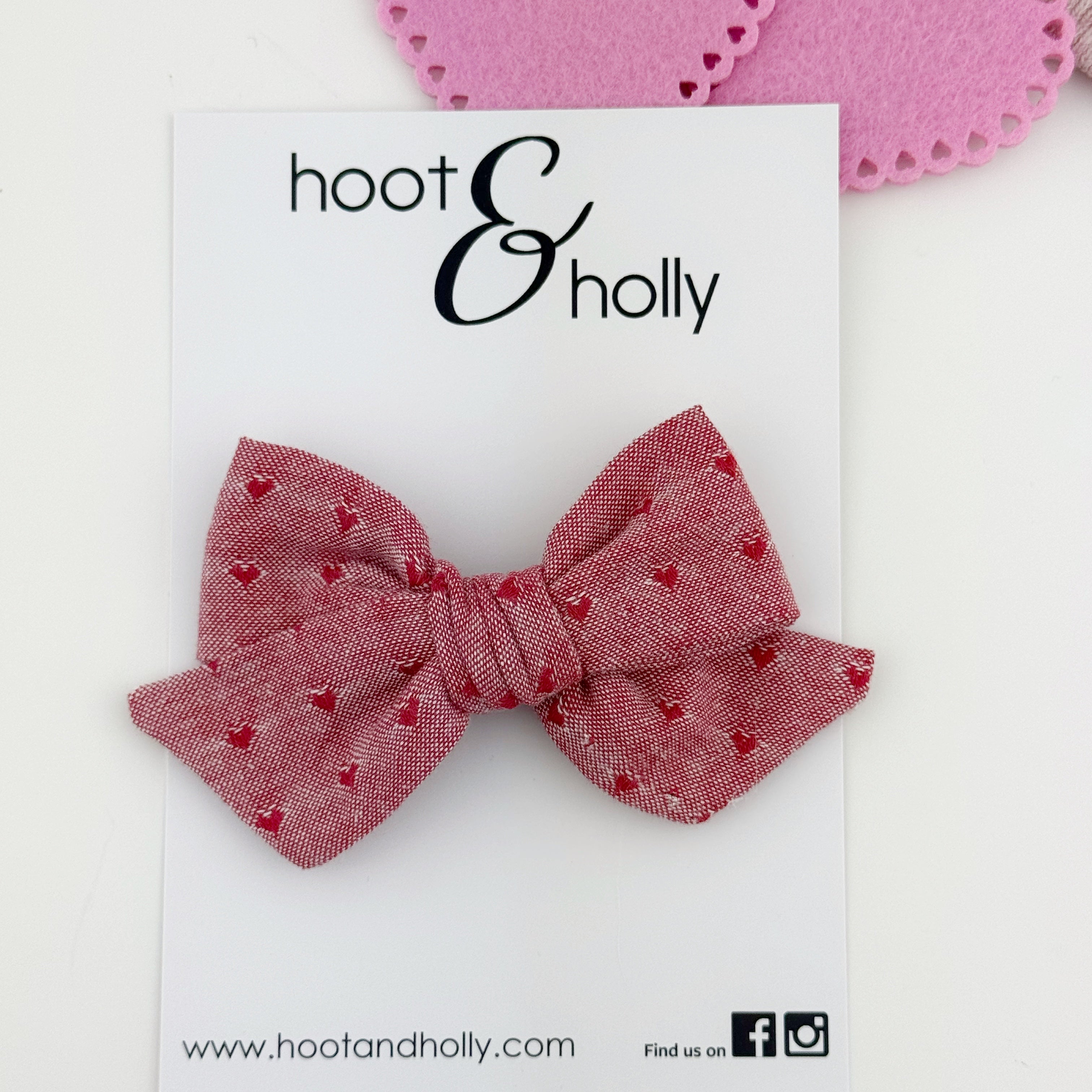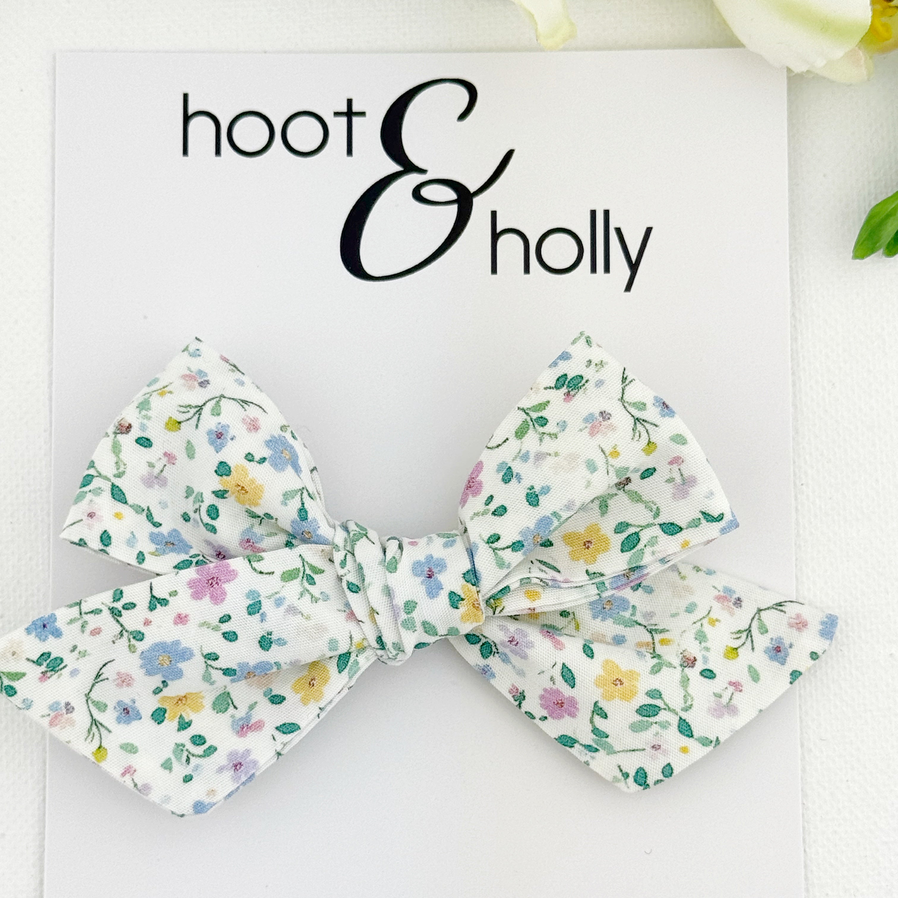 Beautifully crafted hand tied hair bow, the perfect size for babies, toddlers and girls of all ages. Victoria Bow size: 4" wide by 3" . Hair Clip - Teeth clip for all hair types - right side placement. Fabric: high quality cotton Handmade in Canada. All bows finished with ribbon lined metal hair clips that are safety tested and certified to be free of heavy metals like cadmium and 100% lead free. Our hair clips meet Canadian safety standards and regulations.