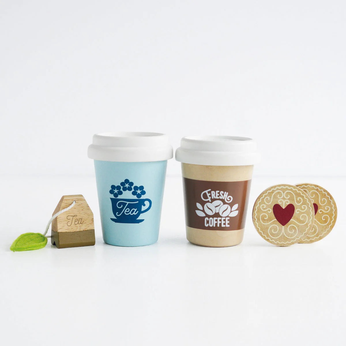 A pair of hot take away drinks ? a tea & a coffee. This set is wonderfully versatile, with a gender neutral design scaled perfectly to the extensive Roleplay collection. Plastic free toy made from sustainable wood and decorated in safe, waterbased paint.