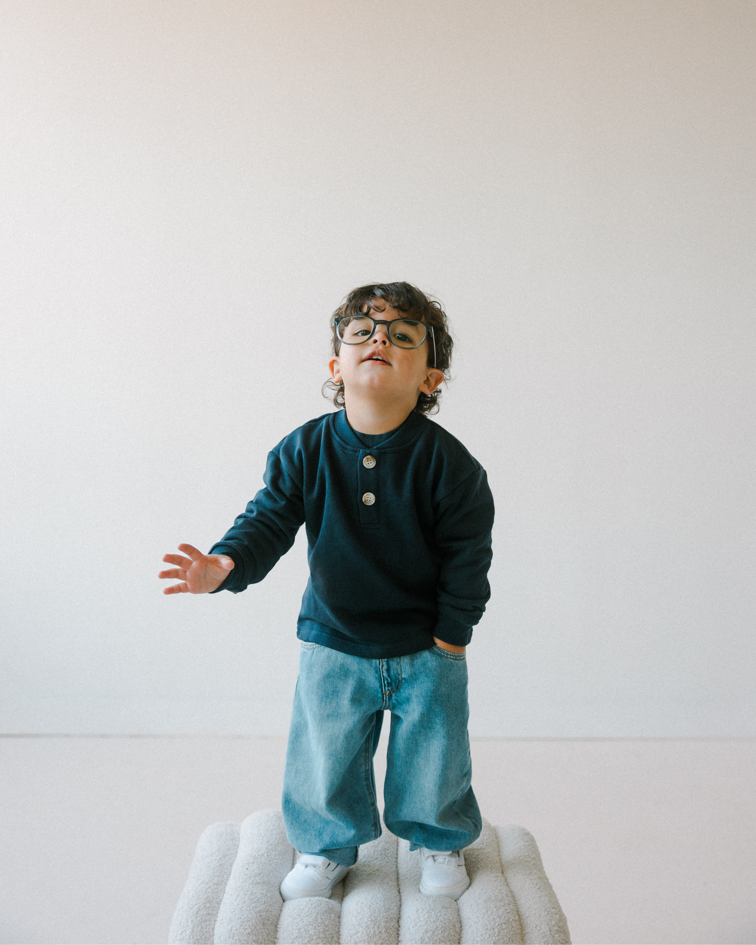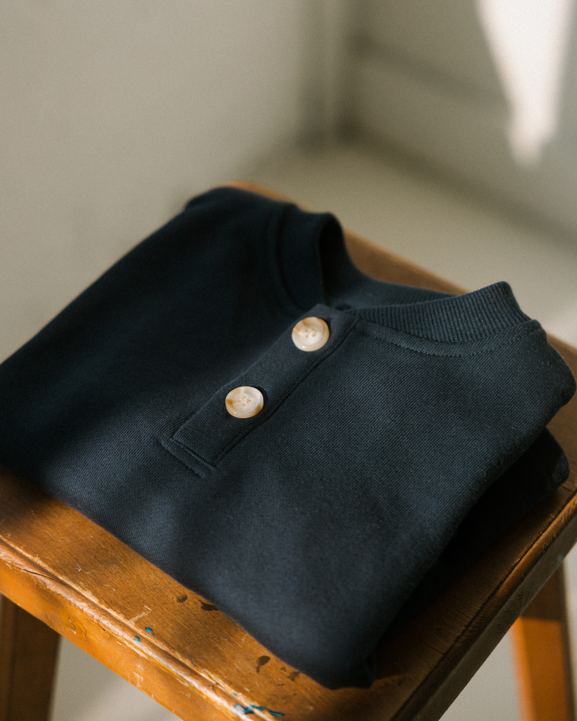 The quarter-button pullover they’ll reach for on cool mornings and chaotic afternoons. Made in soft French terry with just enough structure and a relaxed fit that moves with them. Looks just as good with sneakers as it does under toast crumbs. Carefully made for drop-off days, road trip naps, and everything in between.