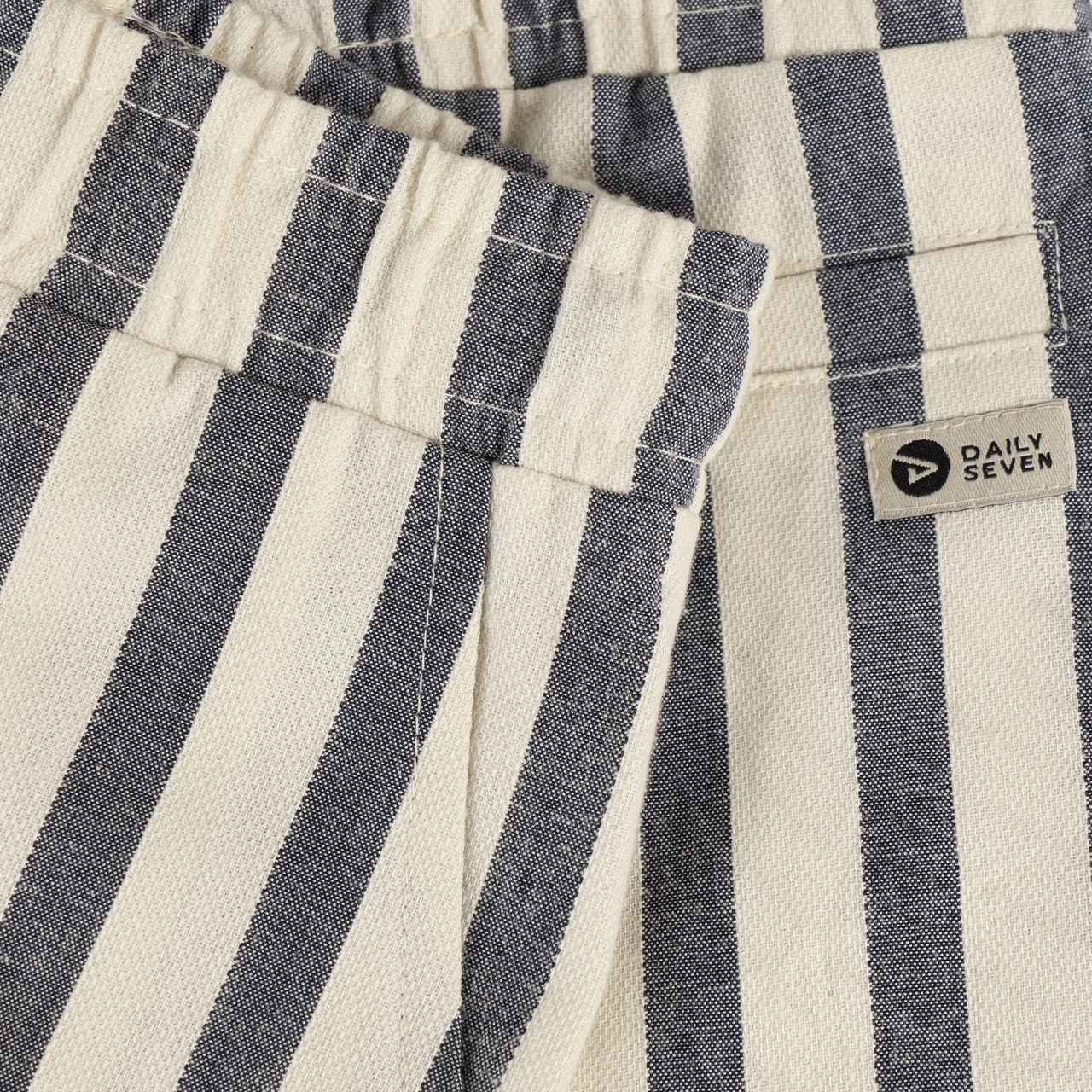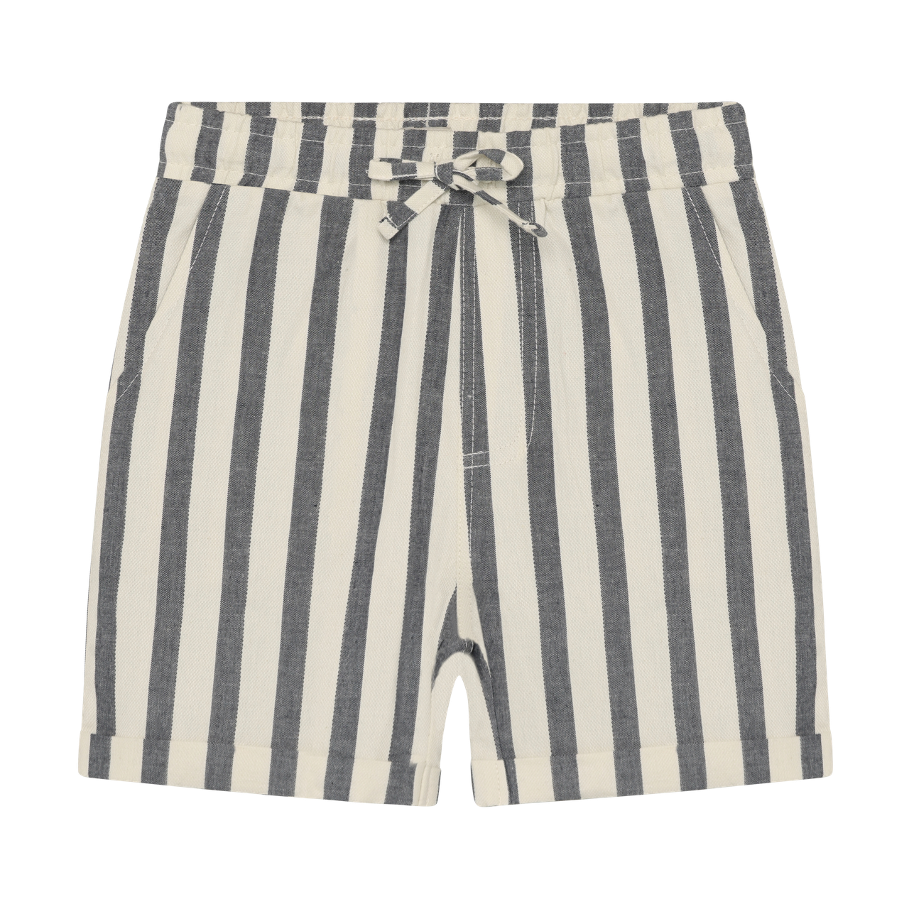 The shorts have an all-over striped print. They have front pockets and an adjustable drawstring at the waist.