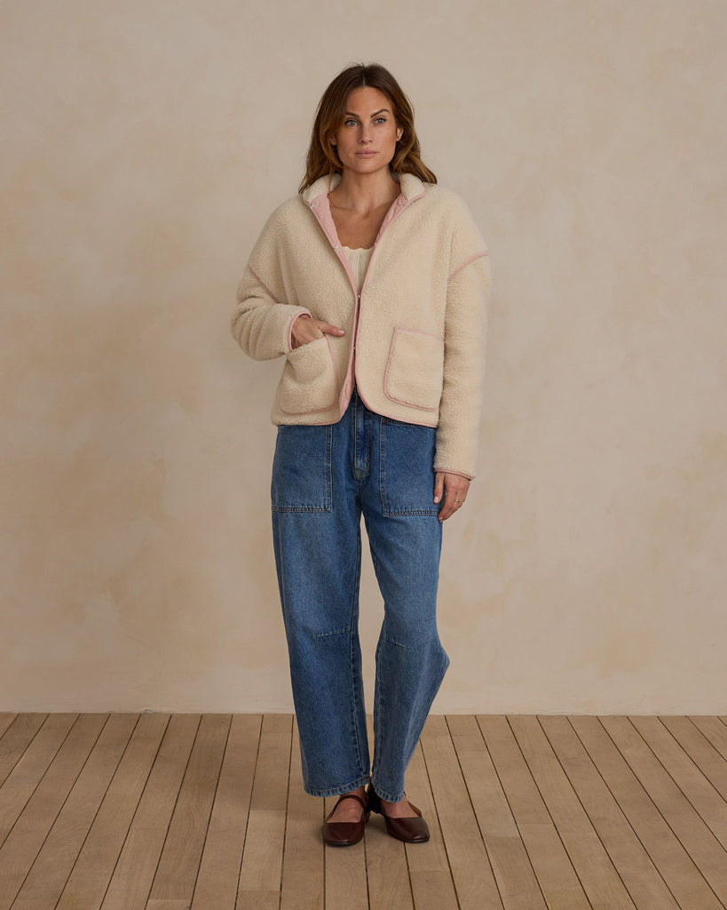 This cozy shearling jacket features functional front pockets and details including rose cord lining and contrast rose binding.