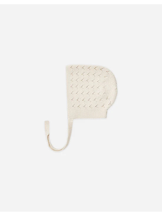 Pointelle sweater knit bonnet with classic chin ties—a charming accessory for cooler days.