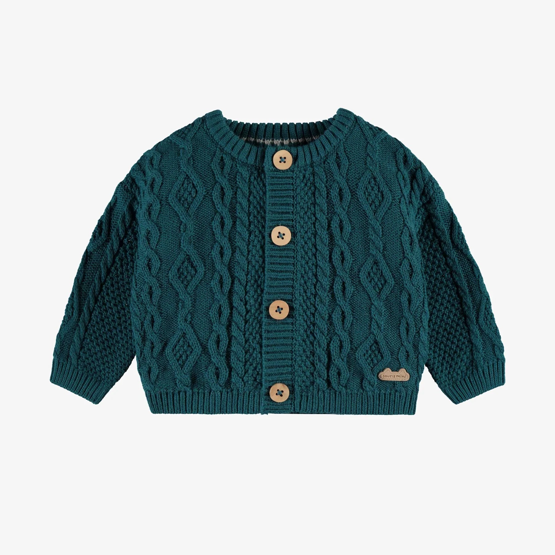 A timeless piece for layering in cooler seasons. This teal cable knit cardigan is made from soft cotton knit for ultimate comfort. It features a classic crew neckline, faux-wood buttons, and ribbed detailing at the collar, cuffs, and hem for a better fit and a polished finish.