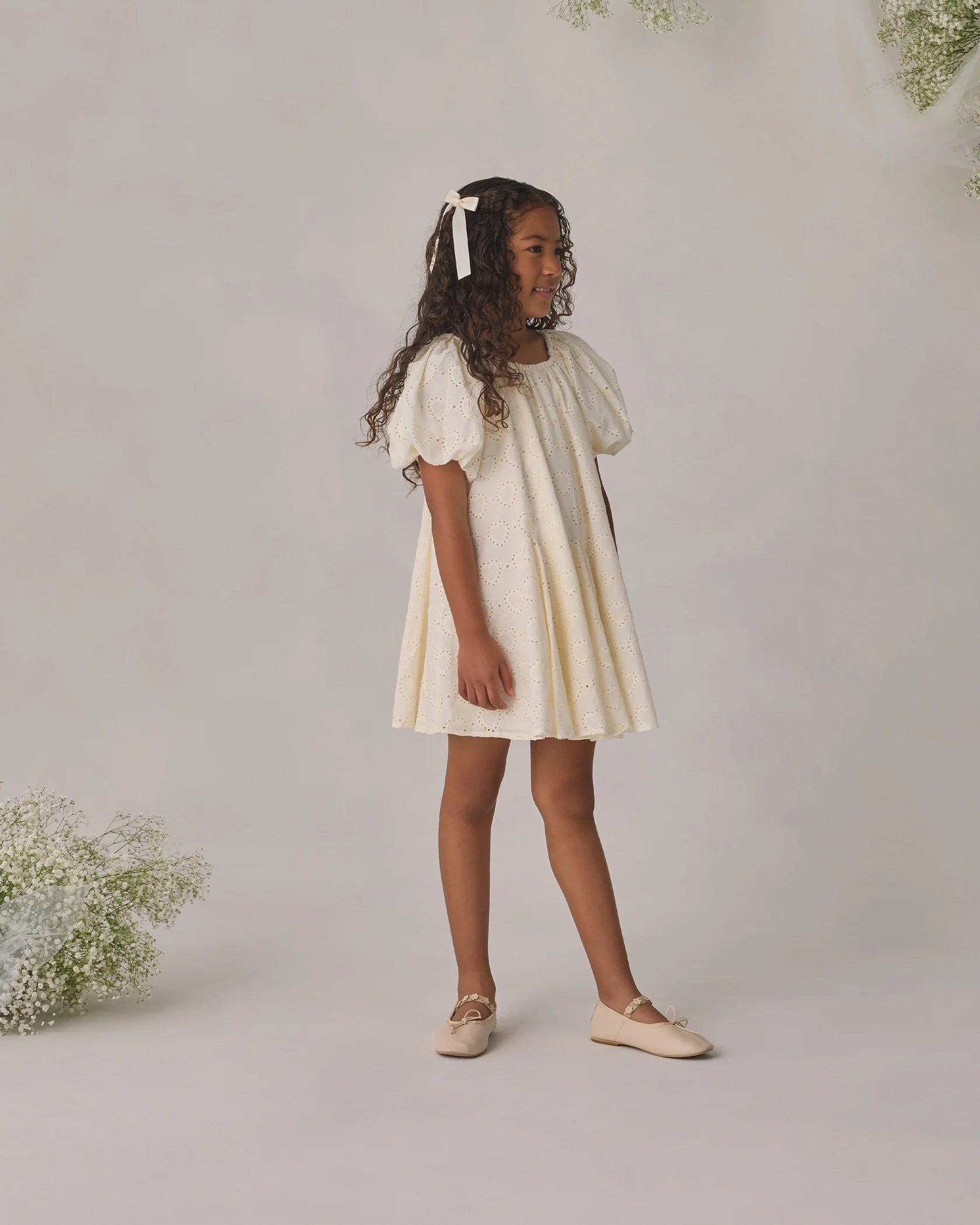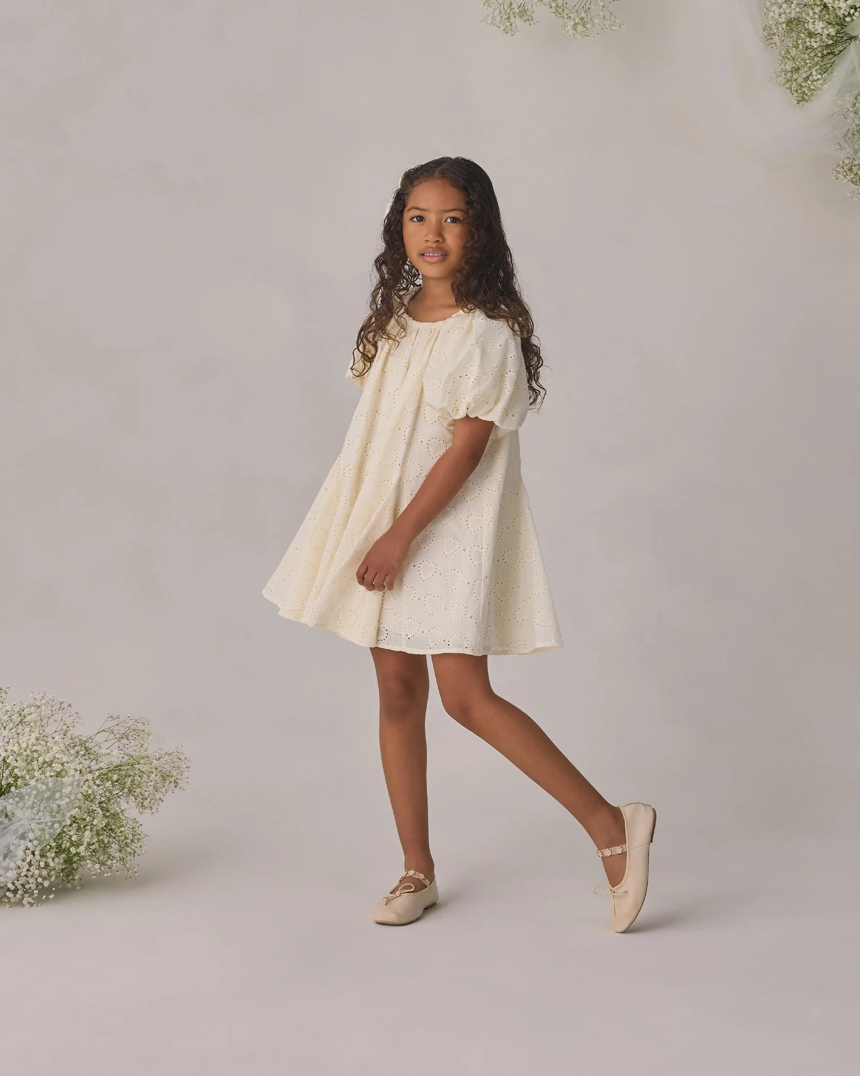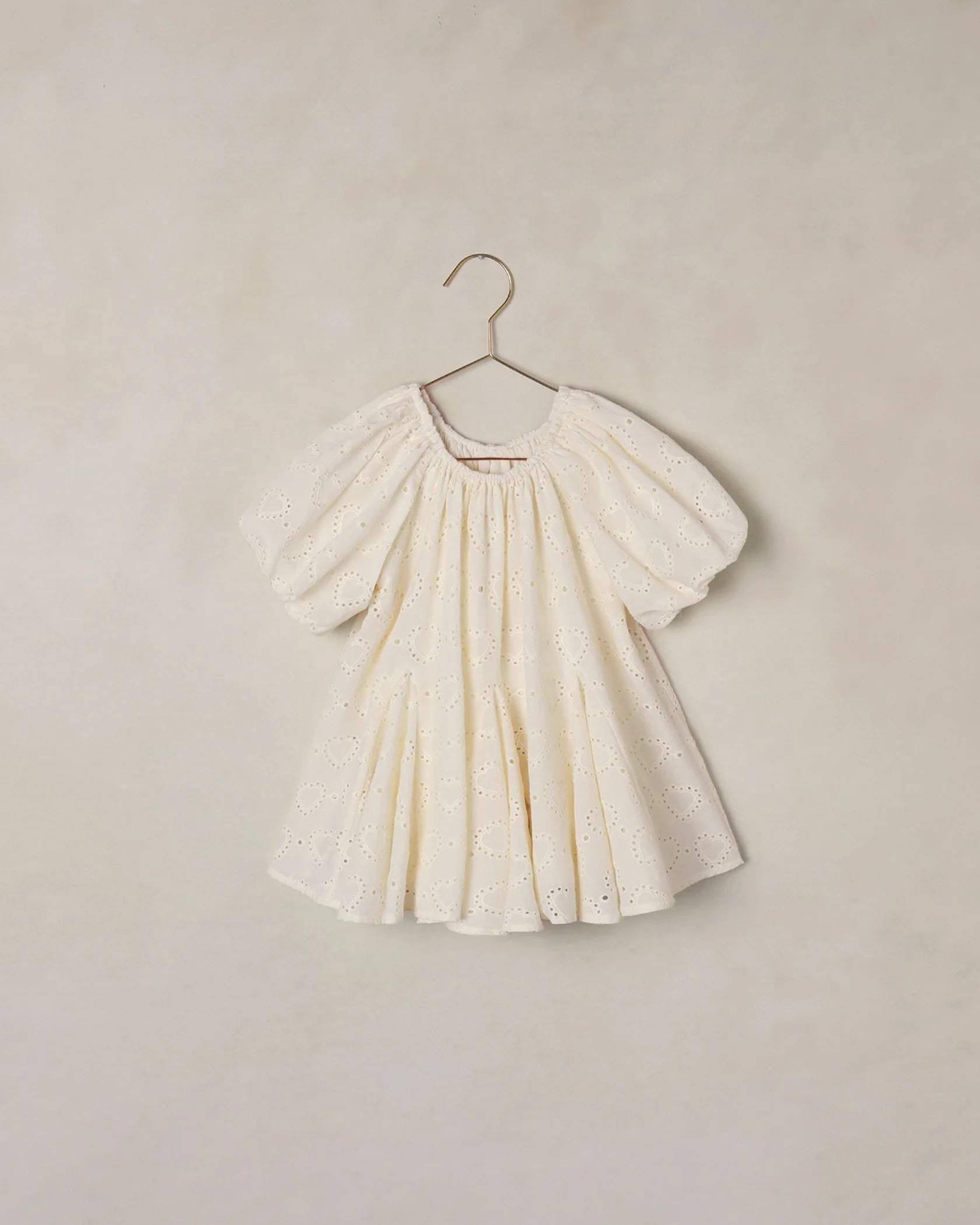 The Maia dress features puff short sleeve and a full volume skirt, in our embroidered heart eyelet fabric.