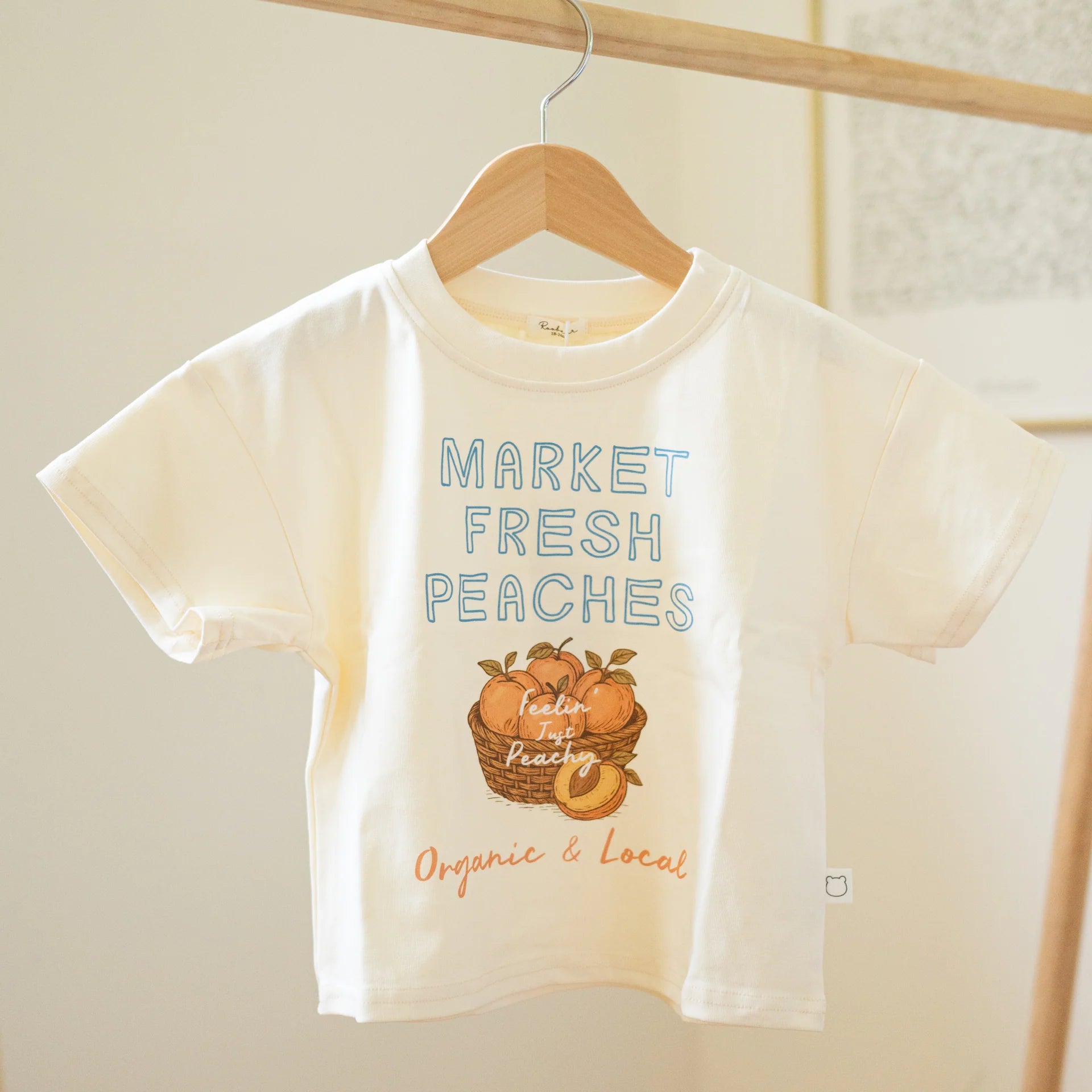 Just Peachy. All day. This sweet tee is made from soft, breathable organic cotton and features hand-illustrated, market-fresh peaches — the juiciest little nod to slow days, sticky fingers, and seasonal goodness. Designed by Roobear, their Canadian mama illustrator, it’s a fruity fave that adds a pop of sunshine to any outfit.
