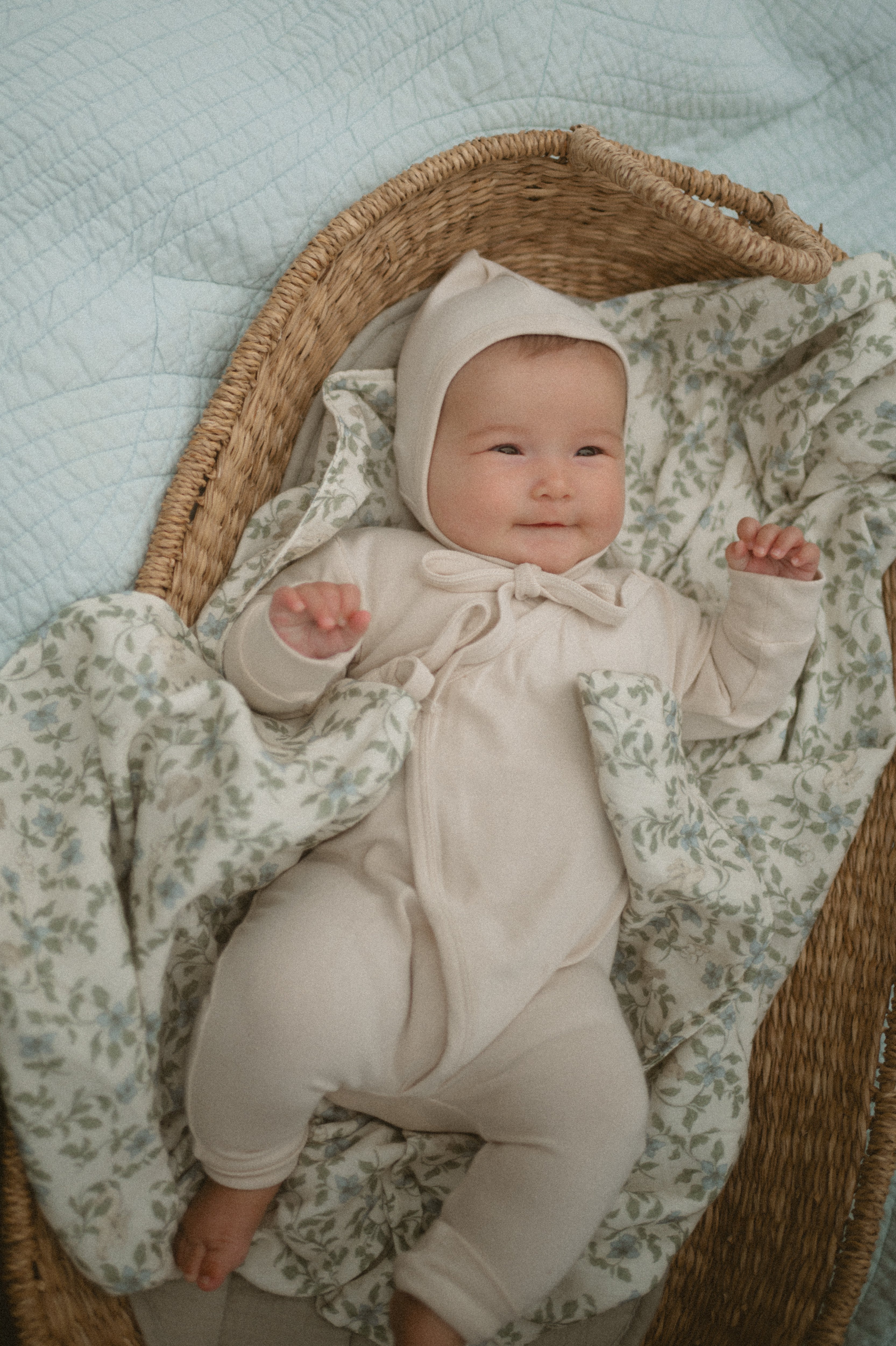 Designed in our Bowmanville studio, PN Baby items are built for soft beginnings and cozy memories. Our side-tie playsuit is made from an ultra-soft blend that includes cotton and merino wool for a cozy feel that only gets softer wash after wash. The self-tie detail and lightweight fabrication mean you can wrap baby up no matter the season. Finished in our 'Oat' colourway.