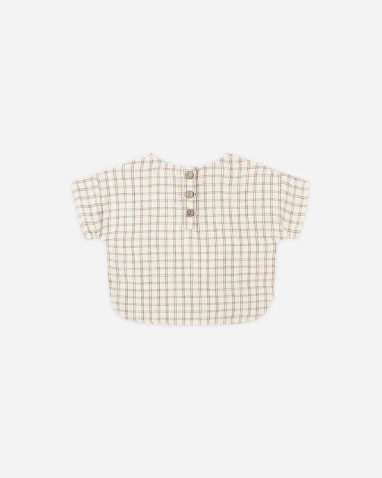 Woven boxy-fit top featuring a front chest pocket and back coconut button placket for easy on and off.